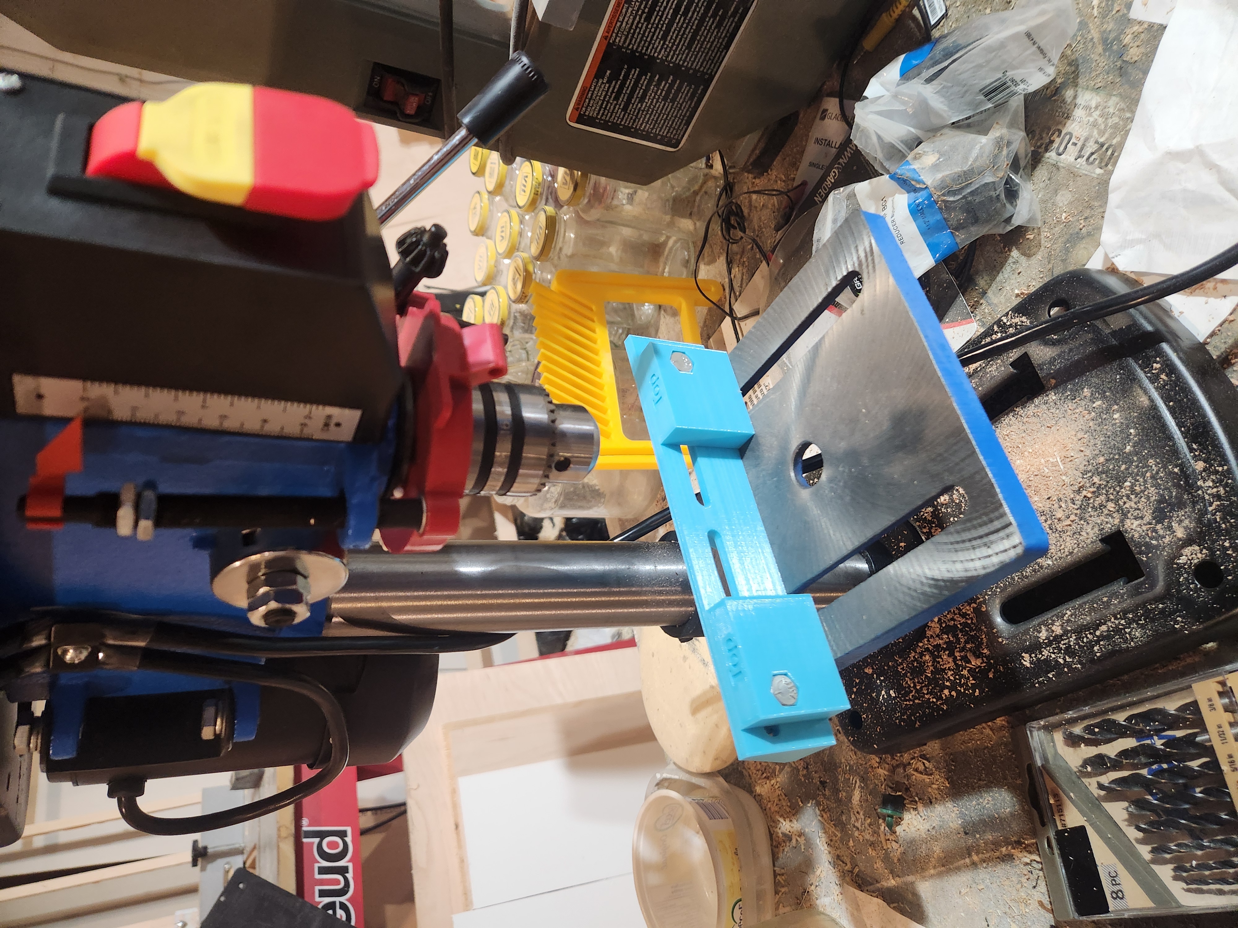Tui có làm cái cữ cho máy khoan bàn này, chỉnh được hết cho hầu hết các loại máy khoan bàn luôn. Có cục chặn, có thể điều chỉnh, bắt ốc vô mặt bàn máy khoan bằng ốc 8mm x 25mm hoặc 5/16" x 1".