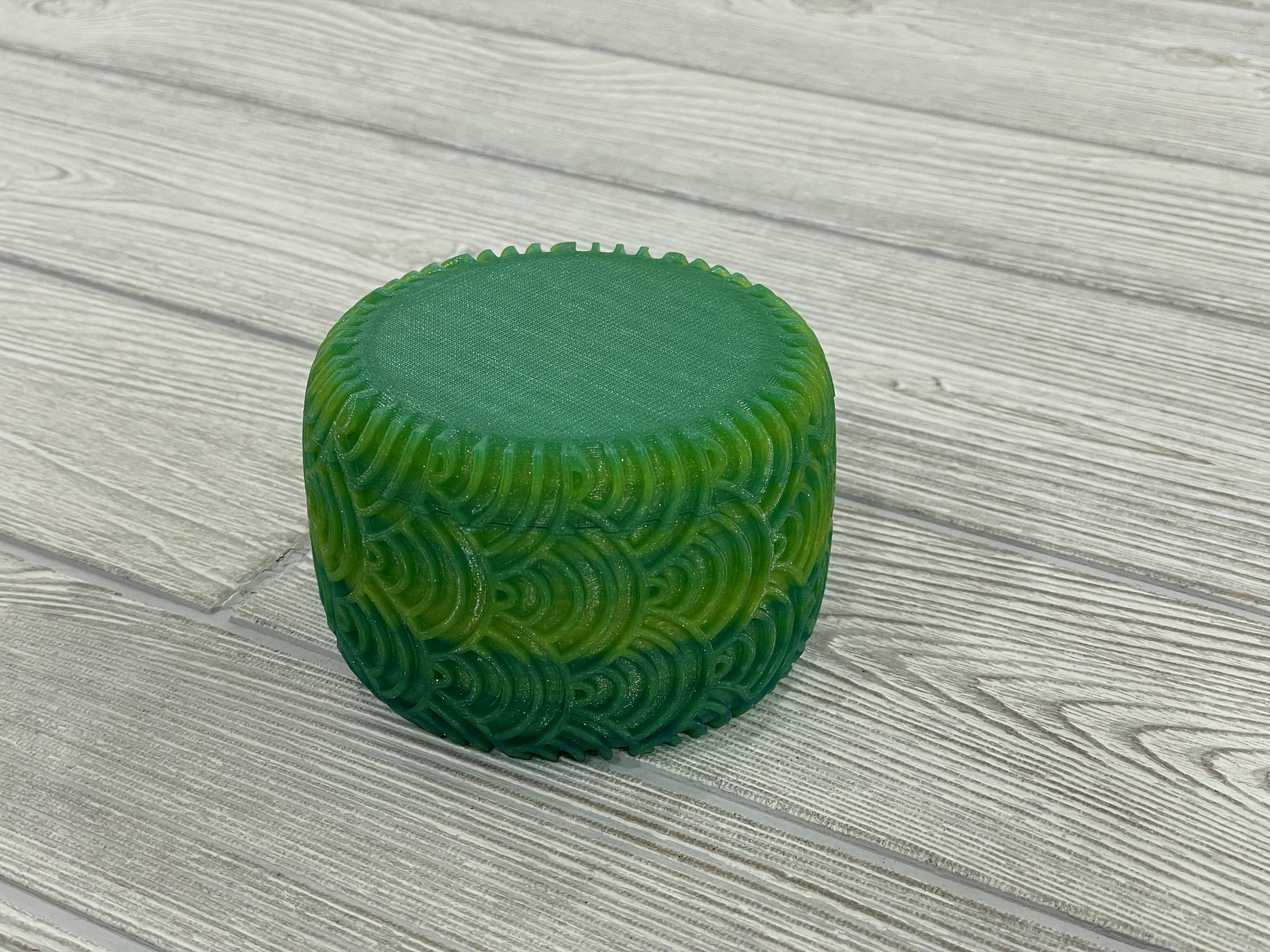 Hộp đựng đẹp mắt với họa tiết trang trí độc đáo, các đường nét khớp hoàn hảo khi đóng lại để che đi đường nối. Đường kính trong 3.0 inch, chiều cao 2.0 inch, không cần supports. Mô hình có thể dễ dàng thay đổi tỷ lệ.