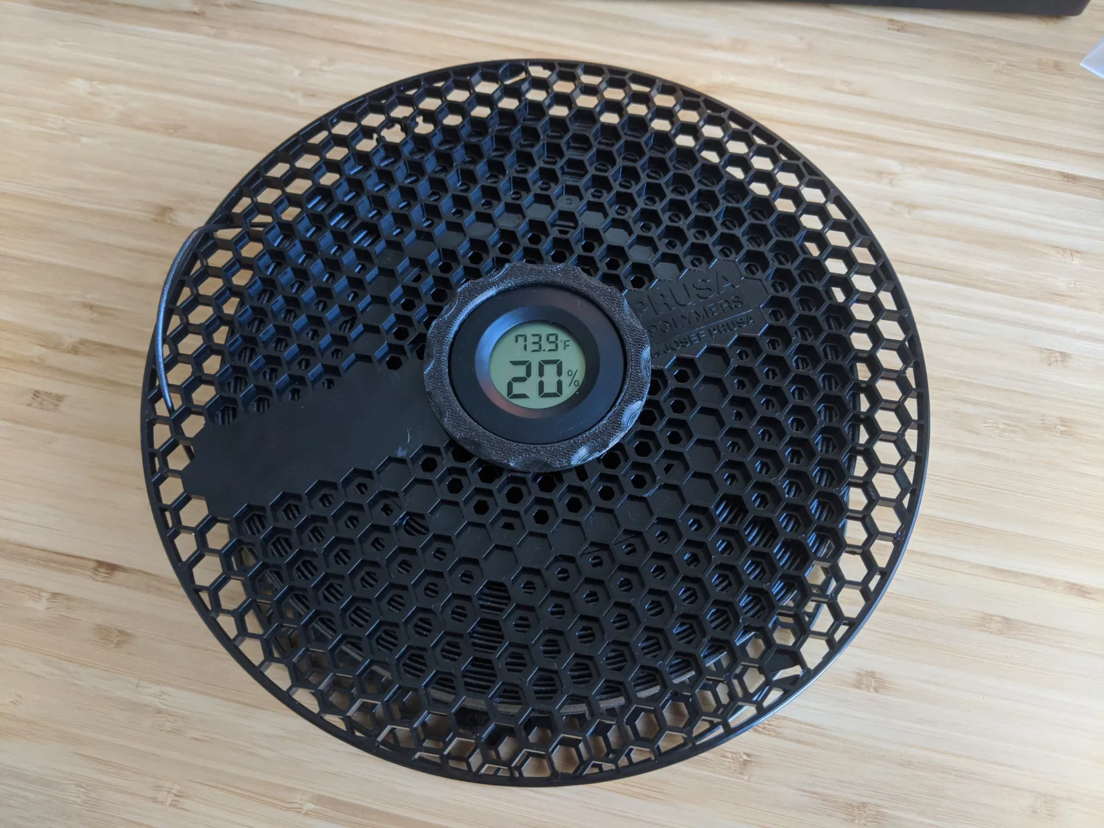 Một hộp đựng chất hút ẩm lắp vừa khít vào cuộn Prusament, chứa gel silica và đồng hồ đo độ ẩm. Hộp này giúp bạn theo dõi nhiệt độ và độ ẩm cho filament, giữ cho vật liệu in 3D của bạn luôn khô ráo và hoạt động tốt.