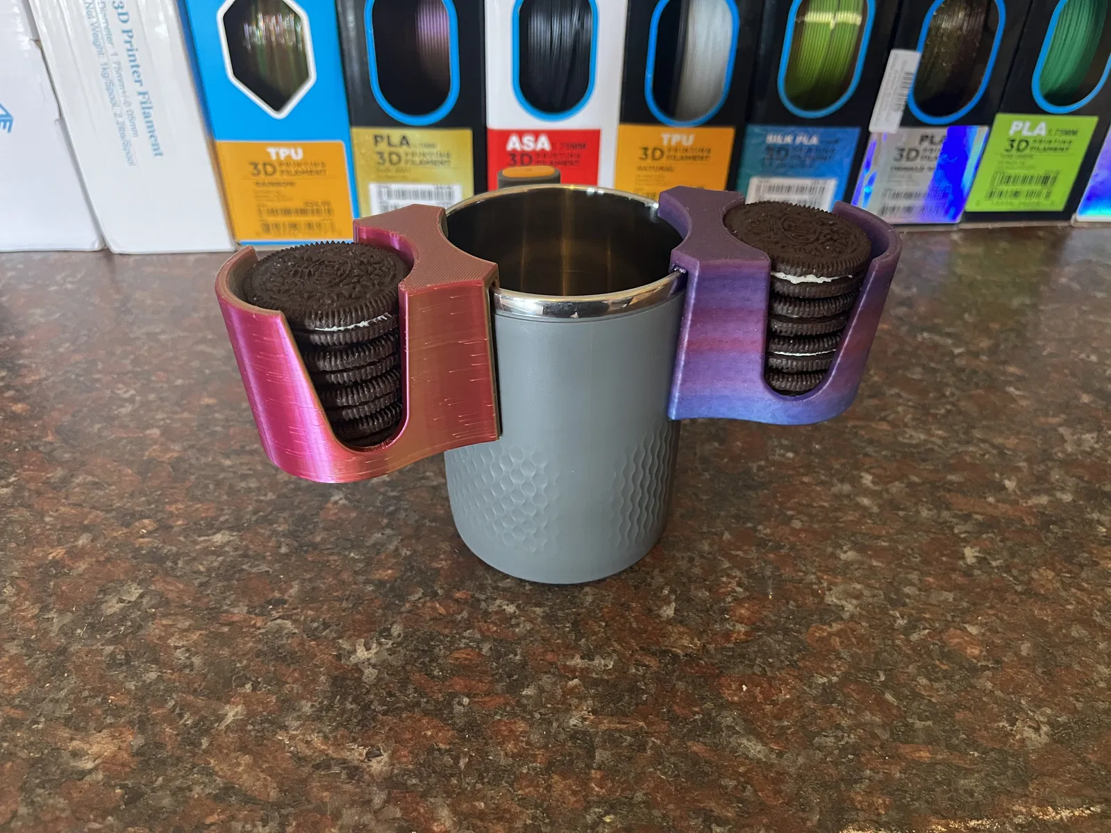 Phần giá đỡ bánh quy được thiết kế thông minh, giúp bạn để gọn 4 cái bánh Oreo ngay bên cạnh ly nước của mình. Có cả bản test cho ly lớn nhỏ khác nhau. Rất tiện lợi và độc đáo!