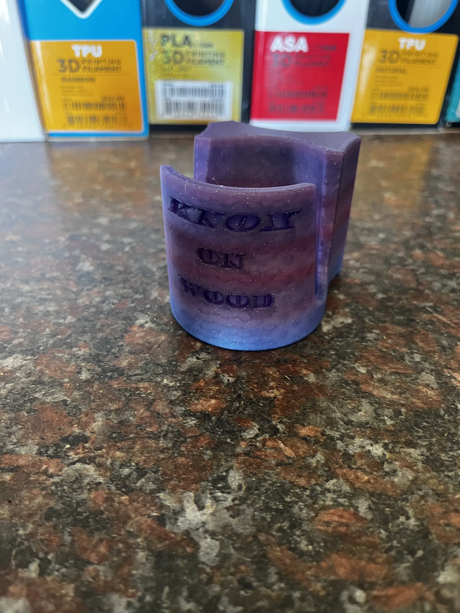 In 3D, in one go, with supports under the arms that sit on the edge of the cup. If you want any text on it, feel free to send me a message with the text and font you want. I can probably do it.