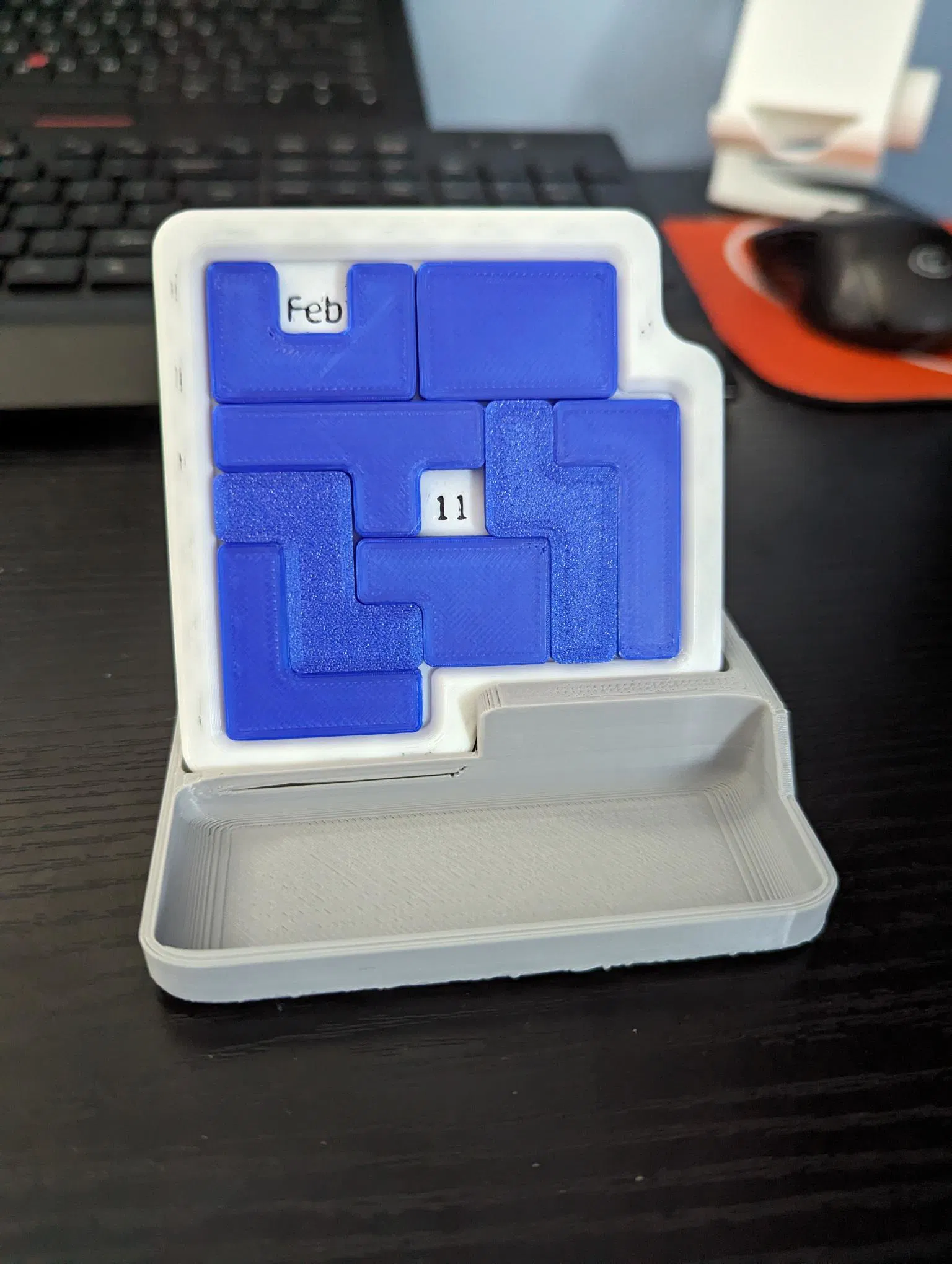 Một bản chỉnh sửa của câu đố lịch, bổ sung giá đỡ màn hình và một cái bát nhỏ để đựng các mảnh ghép. Thích hợp để trưng bày, giải đố và làm đồ trang trí.
