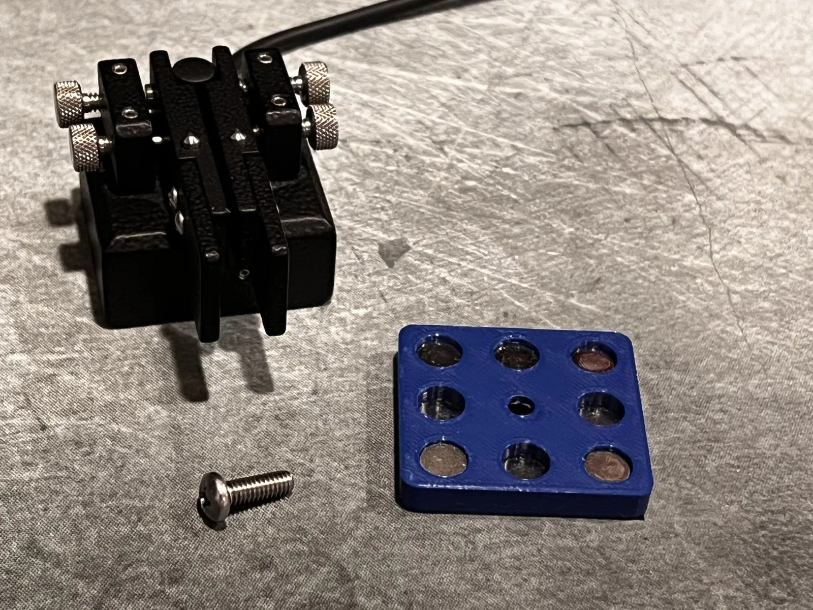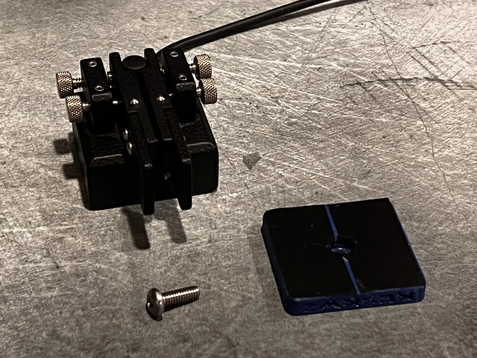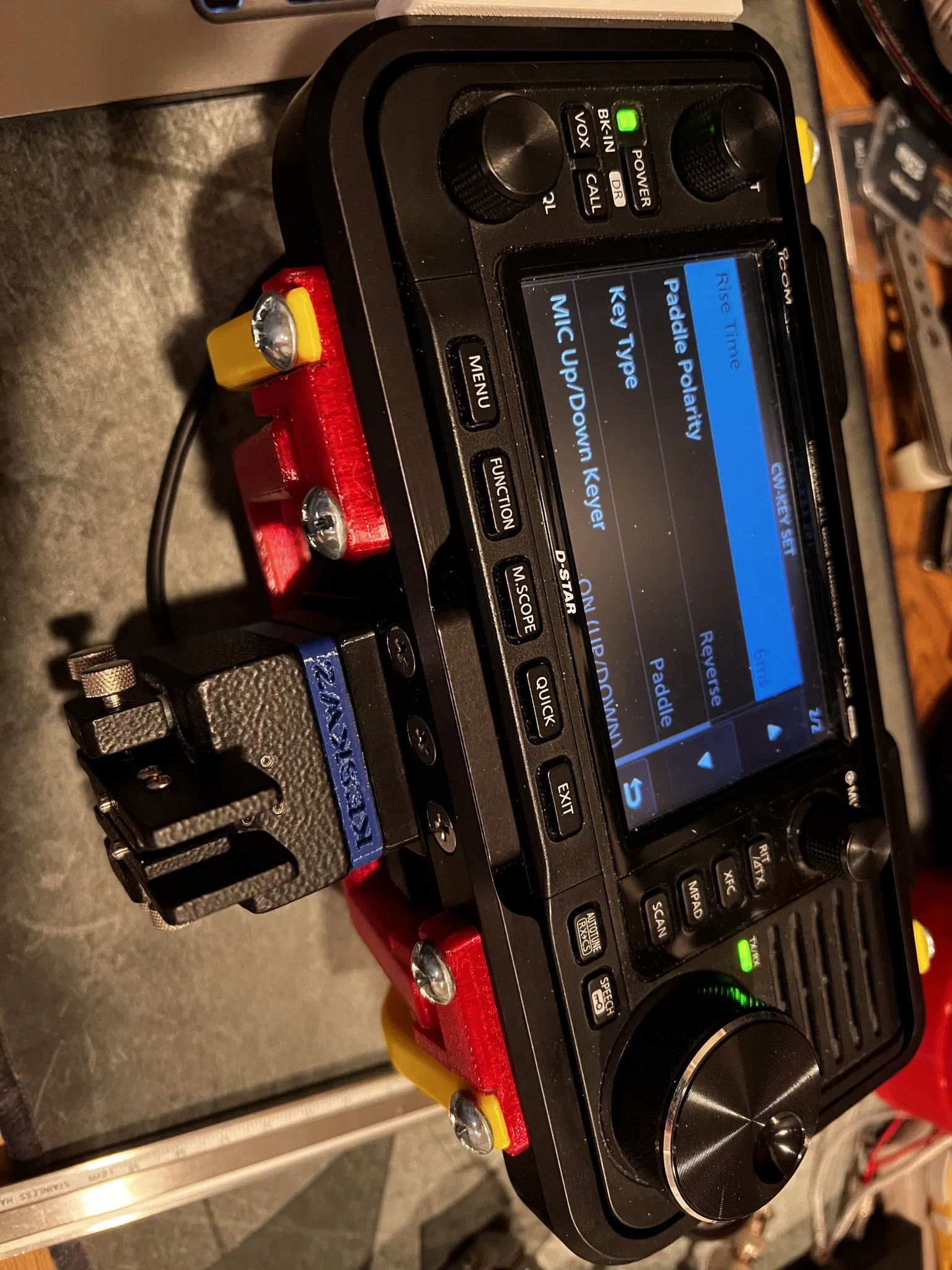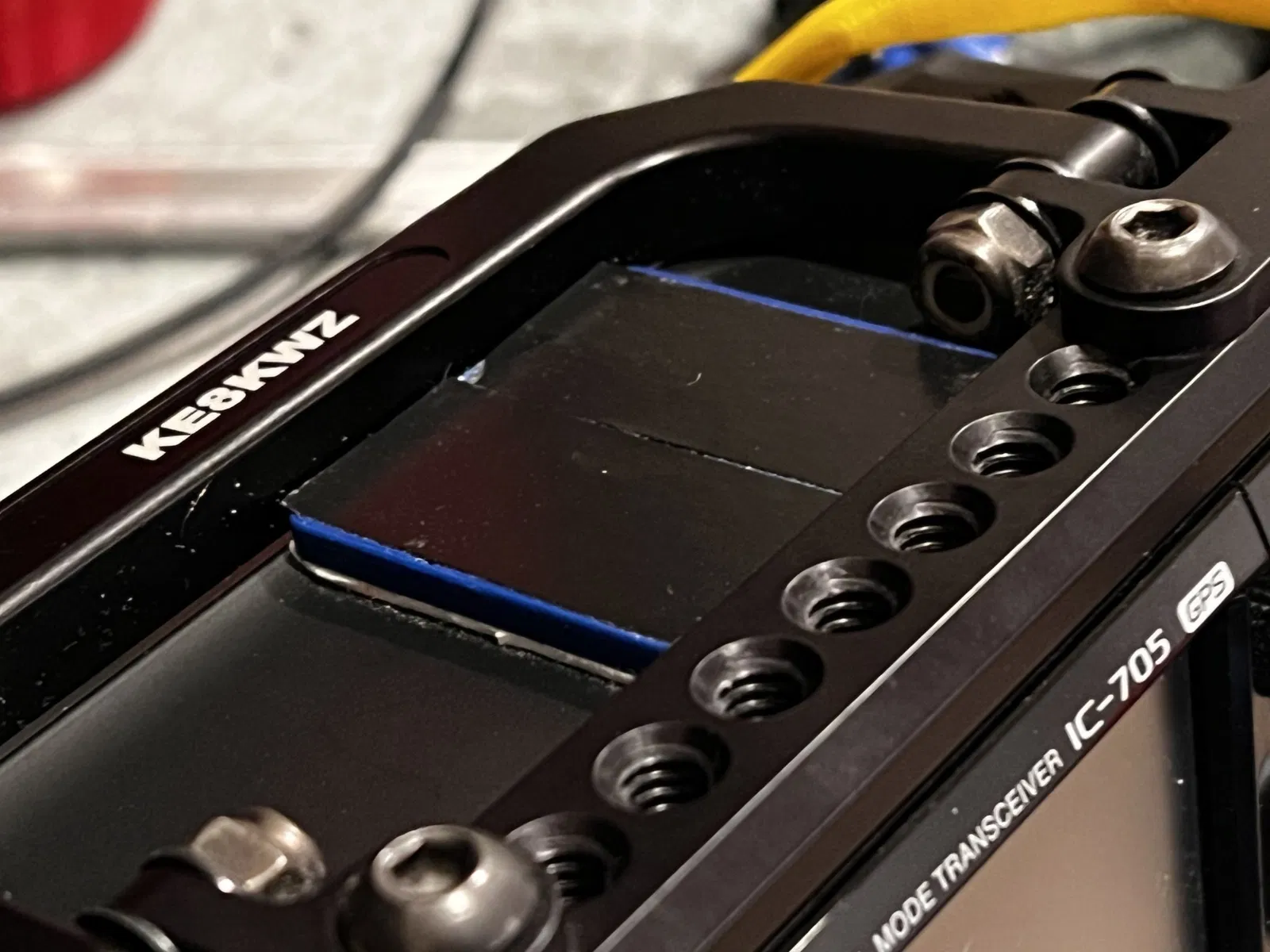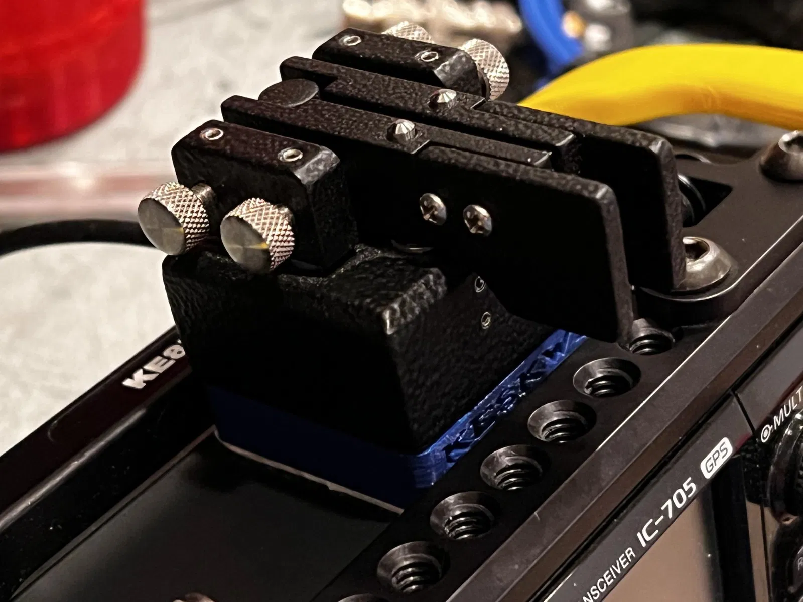 Có ba tệp in. Tệp đầu tiên là tệp dành cho chính chiếc chìa khóa. Nó cao đủ để bao gồm đầu của vít gắn kèm theo. Tệp thứ hai chỉ là tệp đầu tiên nhưng ngắn hơn (bây giờ tôi nhận ra tôi đã quên xóa lỗ vít, thôi thì cũng được). Tôi đã gắn cái đó lên đỉnh IC-705 của mình bằng băng keo hai mặt mạnh (thật dễ hiểu nếu bạn không muốn dán keo lên chiếc radio đắt tiền của mình, nhưng tôi thì thích mạo hiểm). Tệp thứ ba là để sử dụng ở dưới đáy của 705 trong lỗ vít chân máy ảnh. Bạn sẽ cần một vít ¼x20. Lừa bạn bè nghĩ rằng bạn đã mua một chiếc KX3.