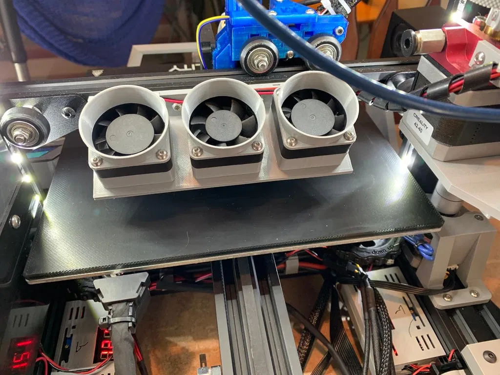 Vậy nó có hiệu quả không? Đây là bài kiểm tra của tôi. Với nhiệt độ môi trường 22 độ C, tôi làm nóng bàn đến 60 độ C và để ổn định. Sau đó, tôi để nó nguội về nhiệt độ môi trường 3 lần và lấy trung bình thời gian - 38 phút. Tôi cũng làm bài kiểm tra tương tự với 3 quạt chạy - trung bình 18 phút. Vì quạt được gắn trên trục X, thời gian làm mát sẽ thay đổi tùy thuộc vào chiều cao của bản in. Bản in cao 60mm trở xuống mất khoảng 21 phút để nguội và bản in cao hơn 60mm mất khoảng 16 phút để nguội. Điểm mấu chốt là hệ thống này giúp giảm thời gian làm mát của tôi xuống hơn một nửa!