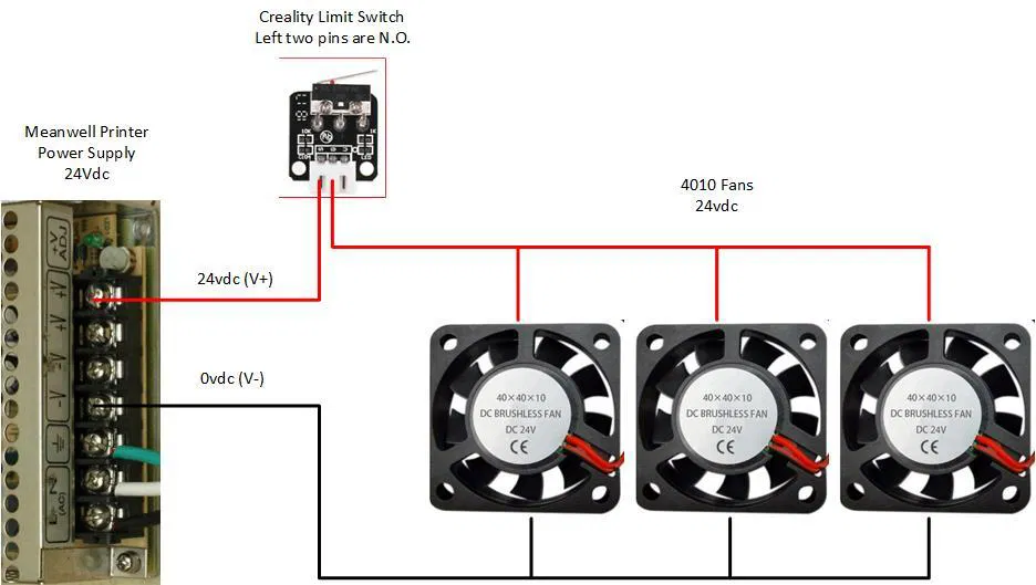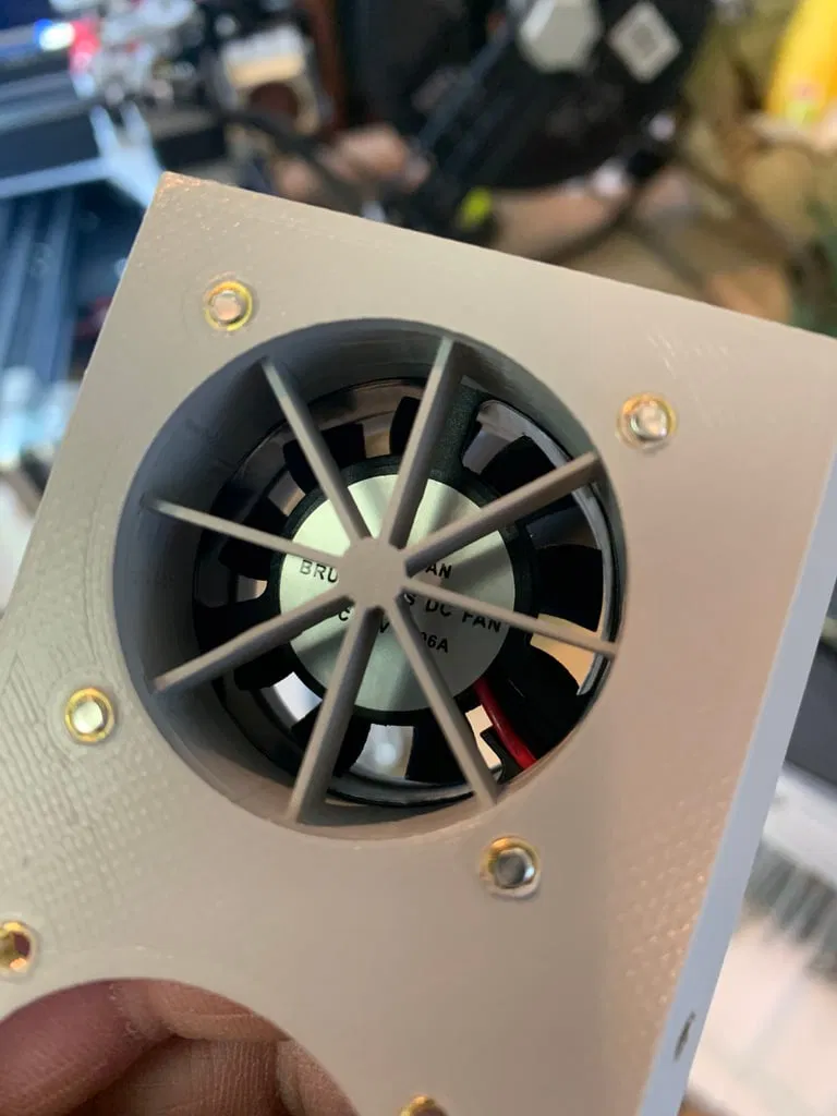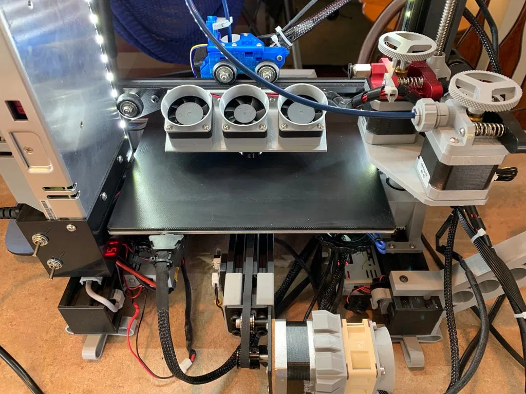 Cách hoạt động là khi in xong, bàn in sẽ trượt về phía trước, kích hoạt một công tắc hành trình và bật 3 cái quạt để làm mát bàn nhanh hơn. Tại sao lại là 3 cái? Vì tôi có sẵn và càng nhiều càng tốt!