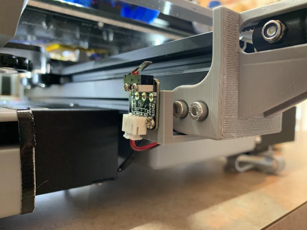 - Tìm một công tắc hành trình của Creality. Bạn có thể mua chúng trên Amazon và AliExpress. Tôi có sẵn một cái. Bạn có thể dùng vít đi kèm công tắc để gắn nó vào giá đỡ tôi đã làm. Sau đó dùng 2 bu lông M3x10 và đai ốc T để cố định giá đỡ bên dưới trục Y, gần phía trước máy in. Điều chỉnh độ cao và khoảng cách với thanh ray nhôm sao cho các con lăn của xe trục Y kích hoạt công tắc khi xe trục Y di chuyển về phía trước.