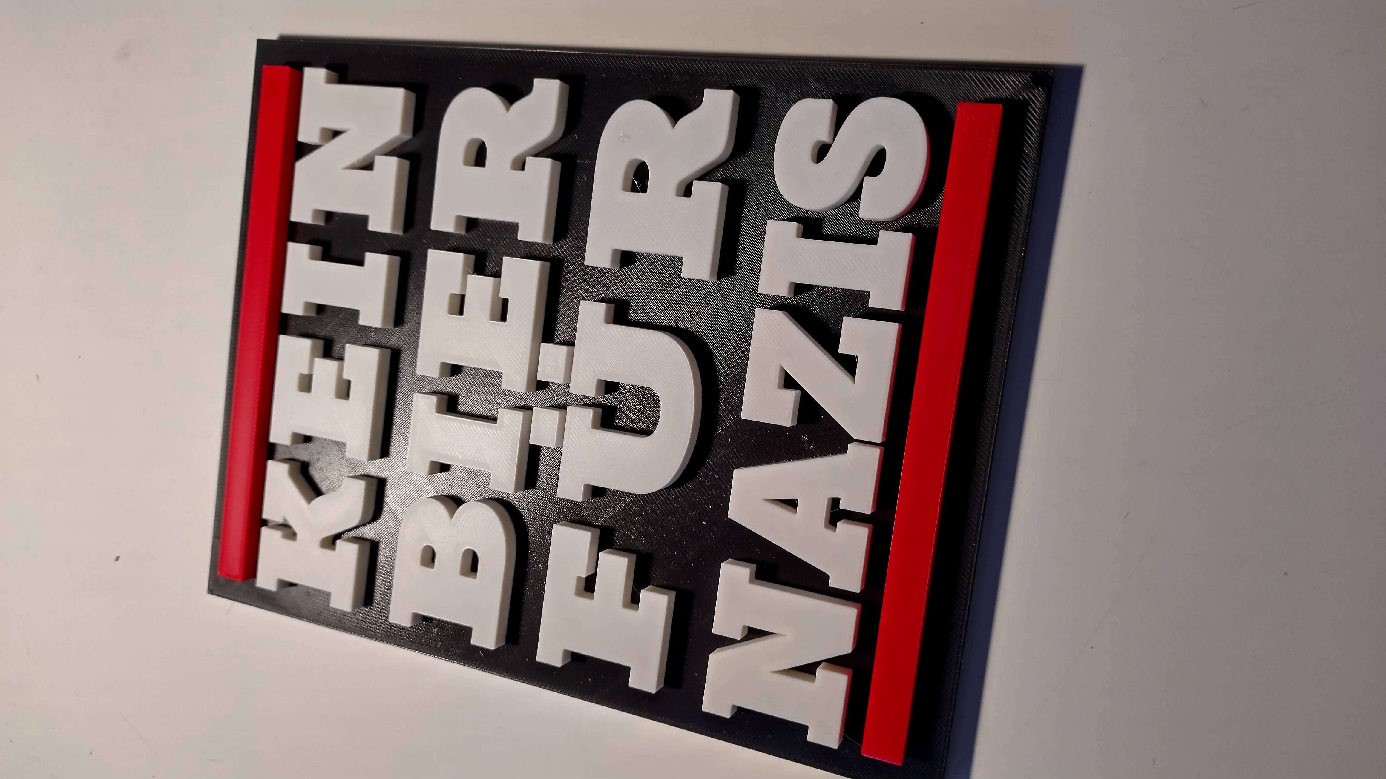 Đây là một tấm bảng in 3D với dòng chữ "Kein Bier für Nazis" (Không có bia cho Đức Quốc xã) bằng tiếng Đức. Tấm bảng có màu đen với chữ trắng và viền đỏ. Dòng chữ này là một khẩu hiệu chống Đức Quốc xã nổi tiếng có nguồn gốc từ Đức vào những năm 1980.