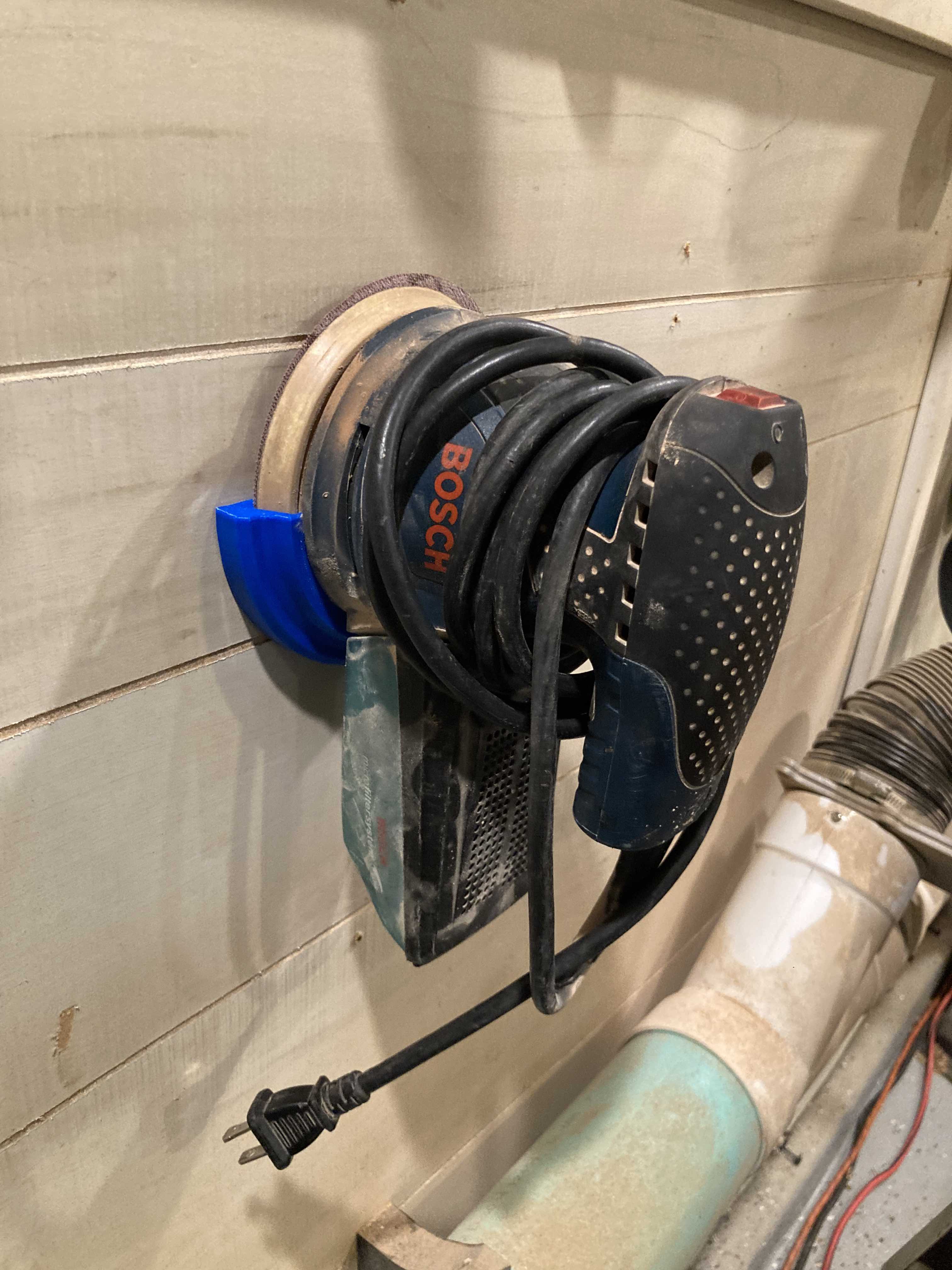 Tôi đã chỉnh sửa cái giá treo máy chà nhám quỹ đạo ngẫu nhiên này để nó vừa với máy chà nhám Bosch 5 inch có dây của tôi. Các lỗ lắp cũng đã được thay đổi, để nó có thể được lắp chỉ bằng hai con vít vào một trụ tường duy nhất.