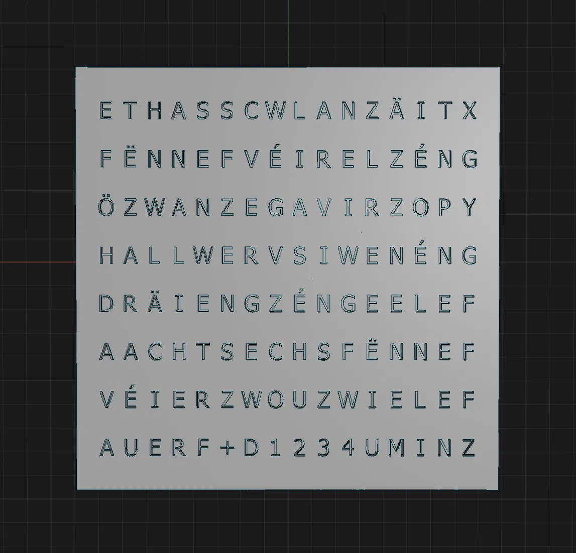 Đồng hồ chữ WordClock xài mâm LED 16x16, font chữ thường, xài tiếng Luxembourg (lëtzebuergesch). In khung, mâm LED, đế đỡ và nắp từ mẫu gốc nha.