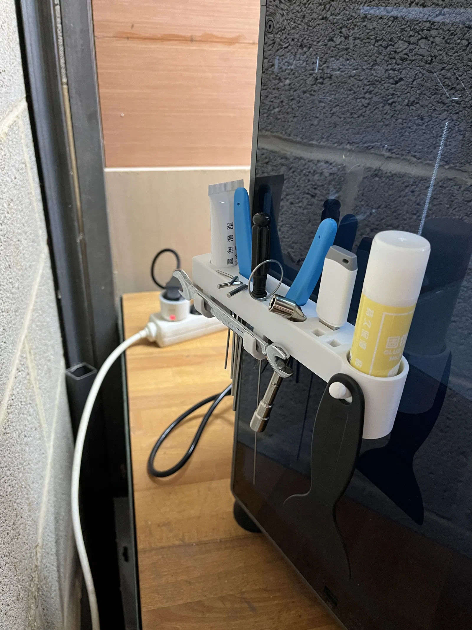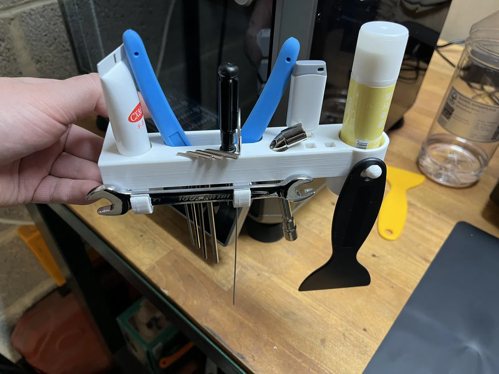 Cập nhật giá đỡ dụng cụ từ Andre Santos, có thêm chỗ để keo, mỡ bò, cờ lê và dao gạt. Phiên bản nâng cấp này giữ nguyên chức năng gốc và bổ sung các chi tiết cần thiết cho người dùng Creality K1.