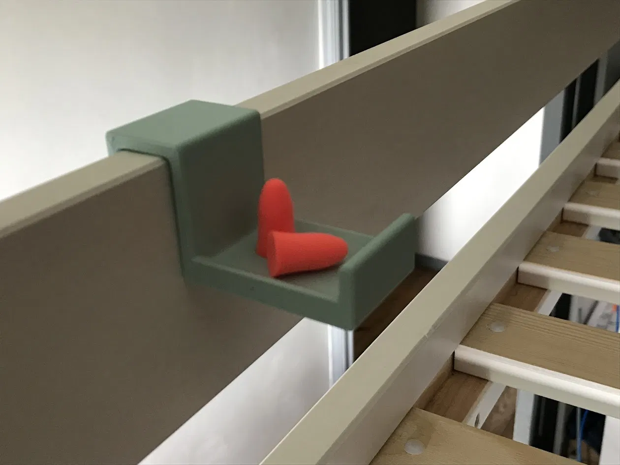 Cái kệ nhỏ xíu có thể đặt trên giường để đựng nút bịt tai và điện thoại của bạn.