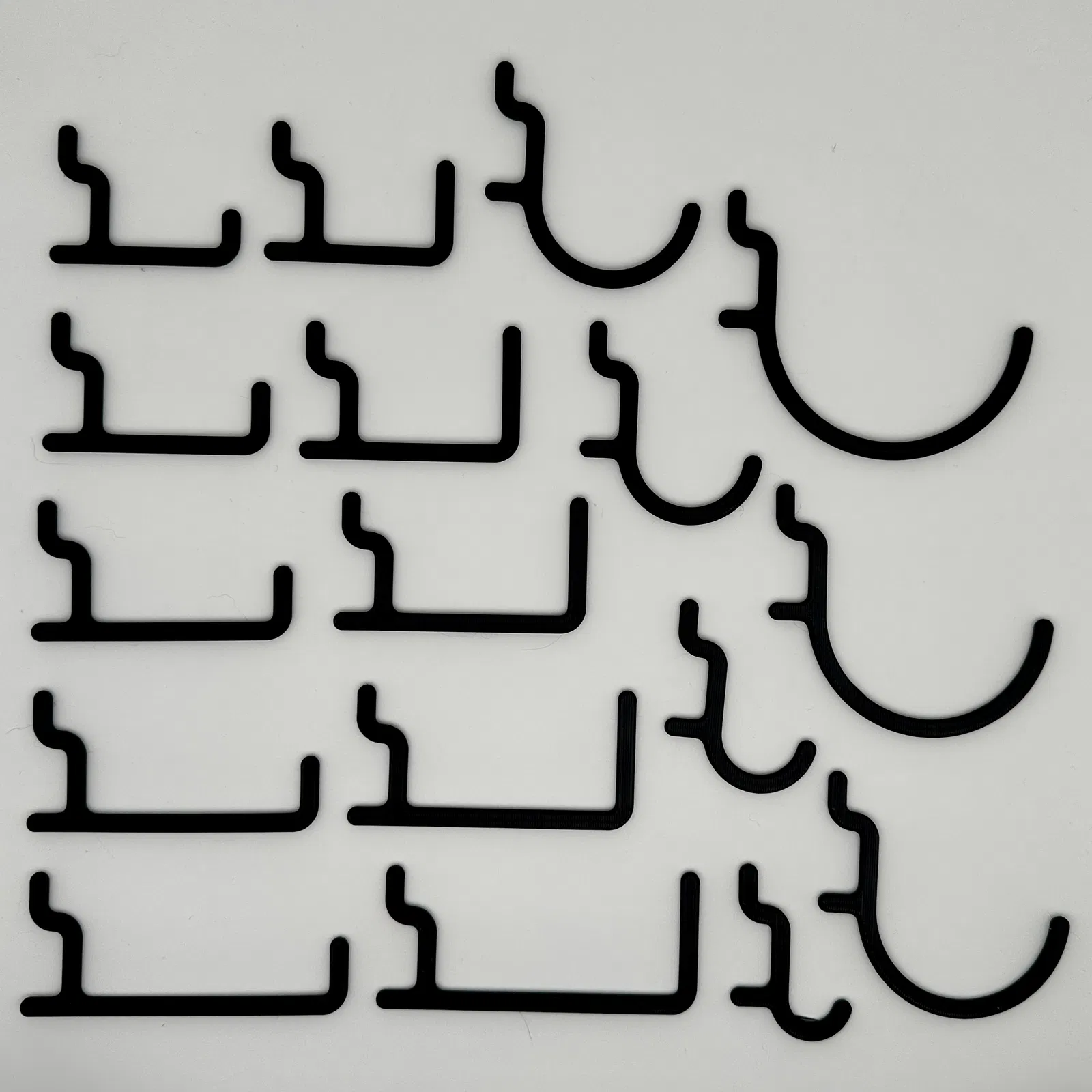 Một loạt móc treo bảng ghim đủ loại để phù hợp với bảng ghim metric có khoảng cách lưới 25mm và lỗ Ø 5.75. Chỉ cần cắm phần cong vào rồi đẩy, sau đó xoay móc xuống để trượt chốt dưới vào - nên vừa khít.