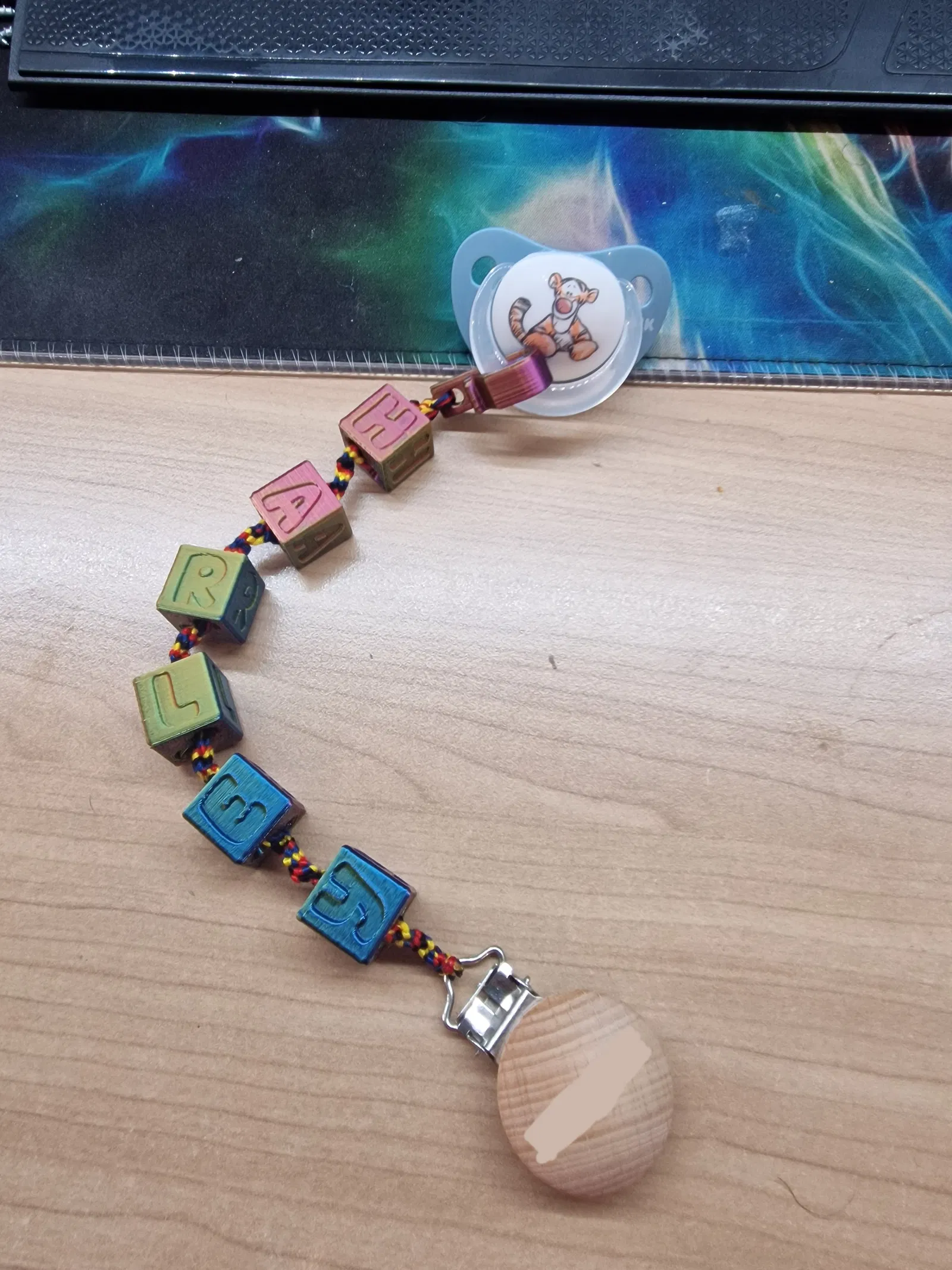 Tiếng Đức: Eine anpassbare Kette für einen Schnuller. Die Kette ist so konstruiert dass sie während das Kind schläft abnehmbar ist.