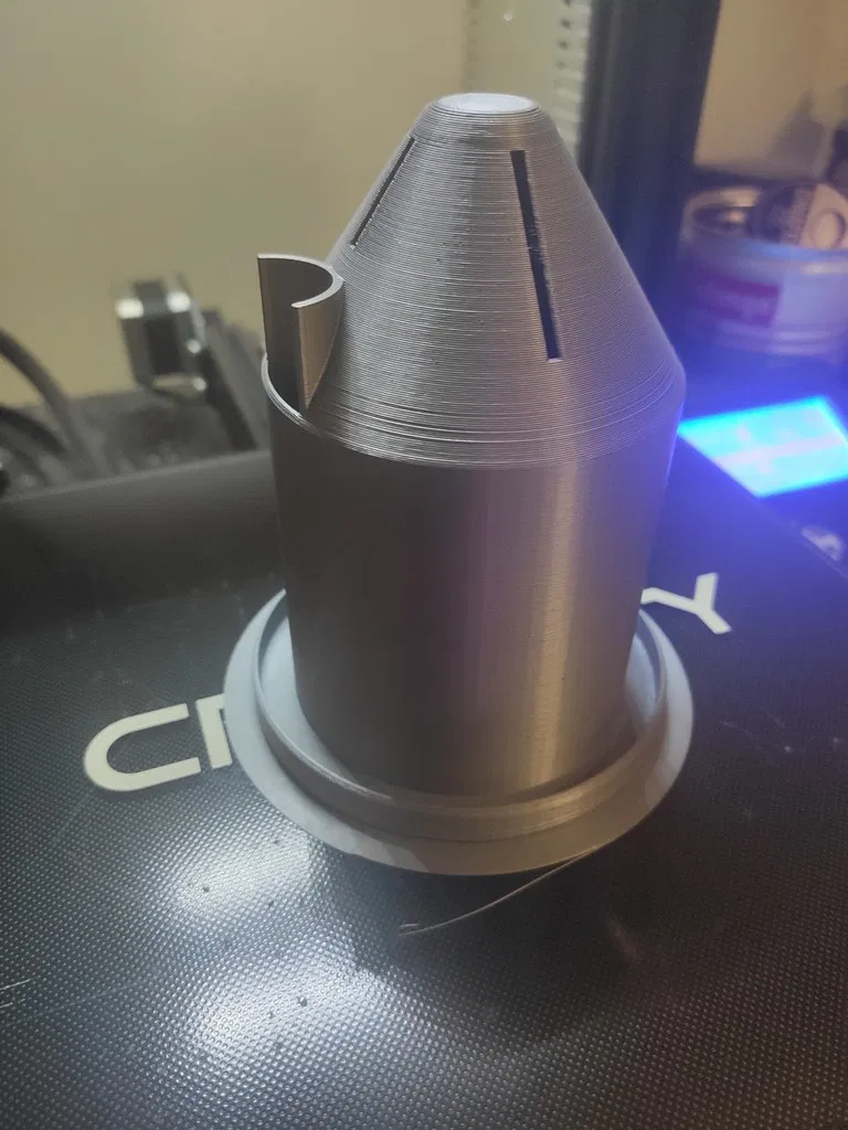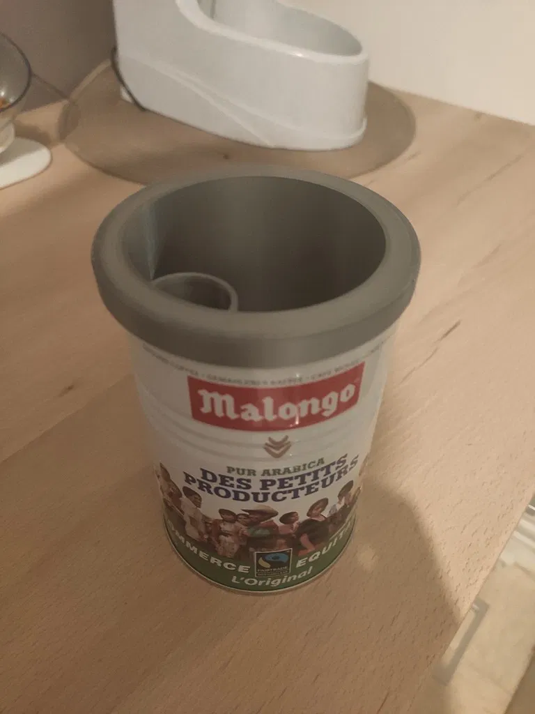 Chậu cây đơn giản có ngăn chứa nước, vừa vặn với lon cà phê Malongo. Cần bật 'brim' trên slicer để bám tốt hơn, không cần support. In bằng nhựa tianse PLA xám, mất khoảng 5 tiếng.