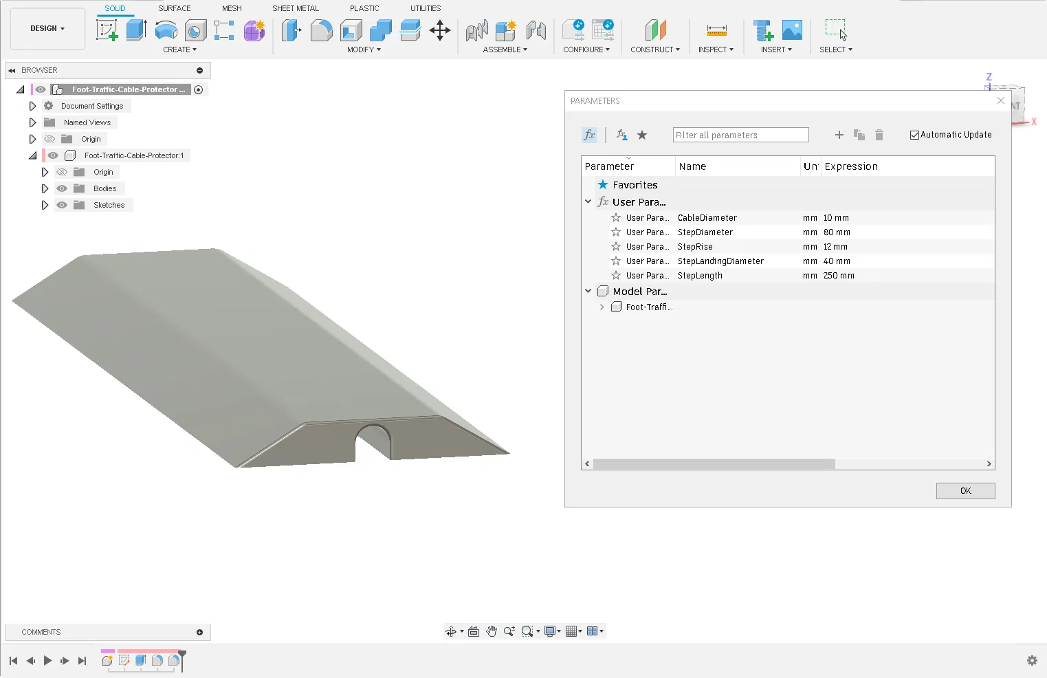 Bộ bảo vệ dây điện đơn giản này, được in bằng PETG, giúp bảo vệ dây cáp khỏi bị dẫm đạp nhẹ. Lý tưởng cho việc sử dụng tại nhà, nó có thiết kế đơn giản và có thể dễ dàng cố định bằng băng keo. File Fusion 360 cũng được cung cấp để tùy chỉnh.