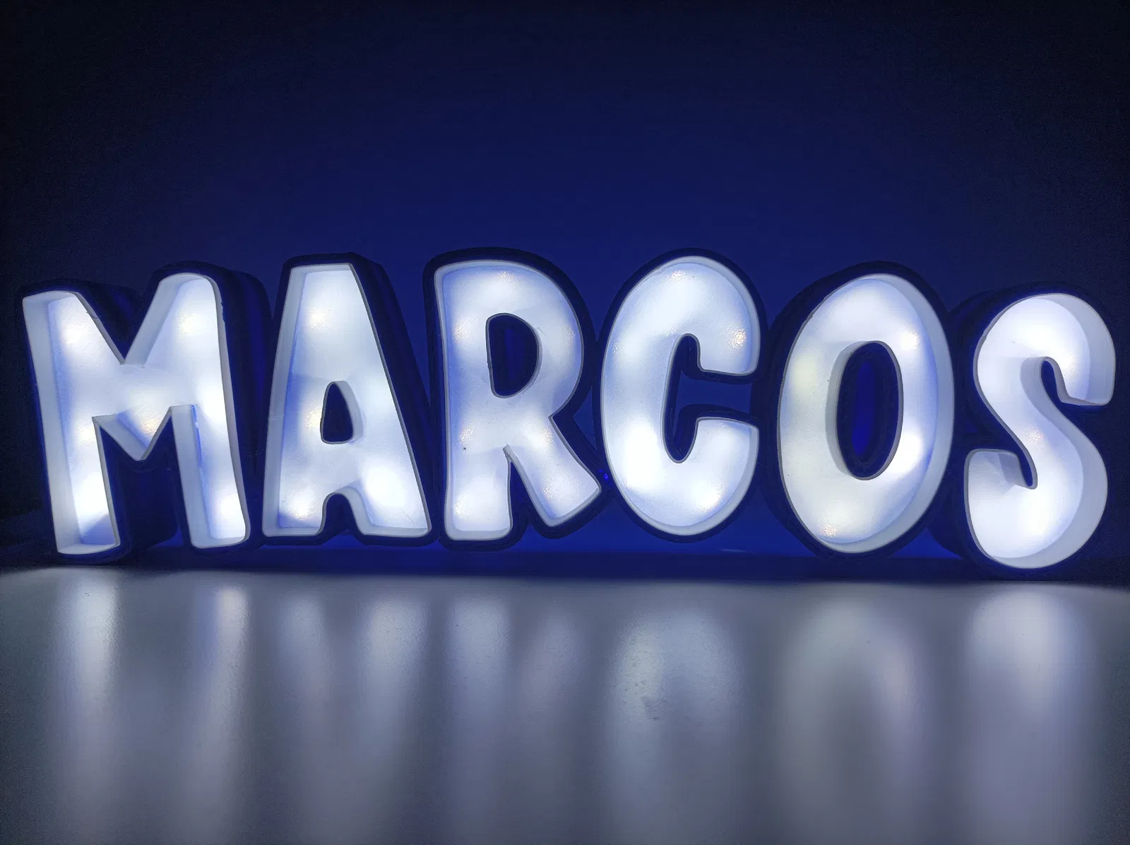 Tạo biển tên LED tùy chỉnh với tên 'Marcos'. Dự án này sử dụng khoảng 2m dây đèn LED màu xanh và trắng, cùng với kéo để hoàn thiện. Hoàn hảo cho việc trang trí hoặc làm quà tặng độc đáo.
