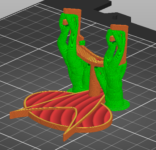 In cái chân đế nhỏ xíu này cho nó cứng cáp cũng hơi khó à nha. Nên xài PETG hoặc loại tốt hơn và giảm tốc độ in (ít nhất là cho phần trên). Tui in với độ dày lớp 0.15mm, 3 lớp bao quanh (phần trên chỉ vừa 2 lớp), 25% vật liệu độn hình dạng Gyroid và dùng supports dạng hữu cơ (organic supports) "everywhere" (xem hình nha).