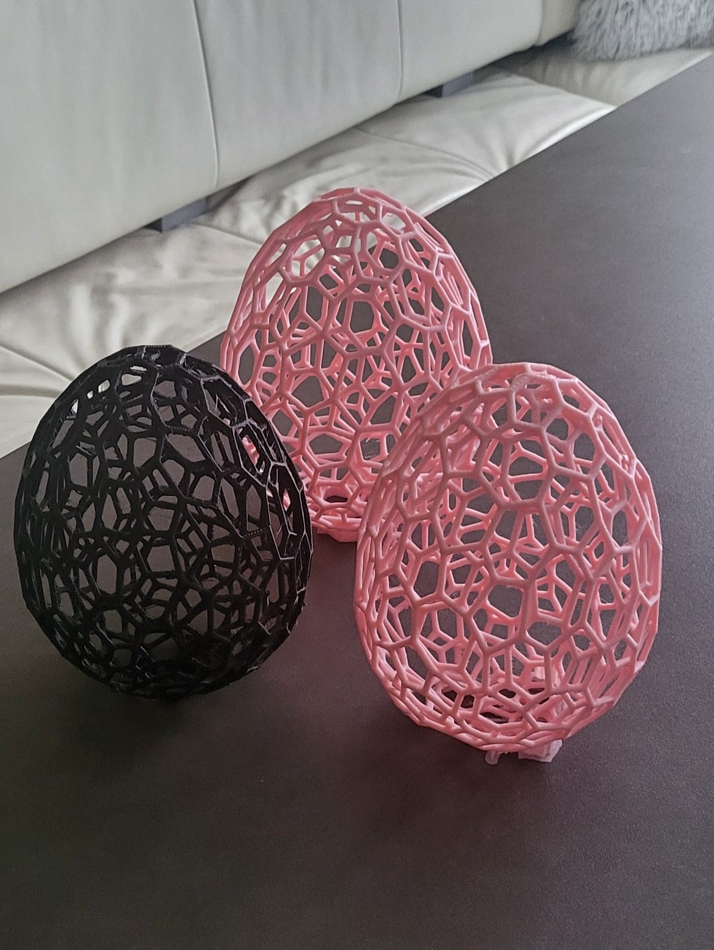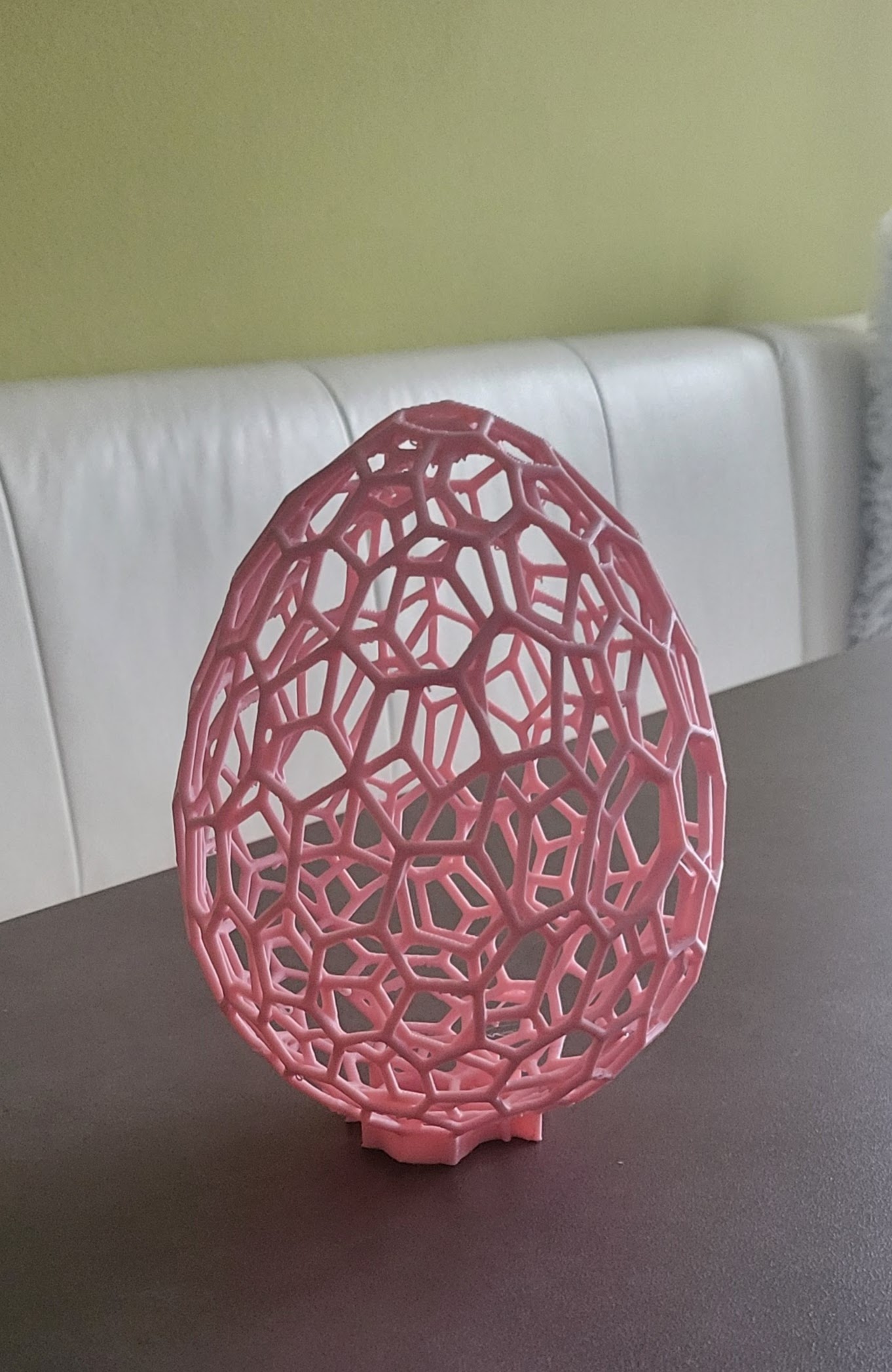 Trứng Phục Sinh Voronoi với tùy chọn có hoặc không có chân đế. Mô hình Voronoi với chân đế khi in cần nhập chung để hòa quyện, khuyến khích dùng brim. Nếu không dùng chân đế, nên vẽ 3cm support ở thanh đỡ dưới. Kích thước tùy chỉnh theo ý.