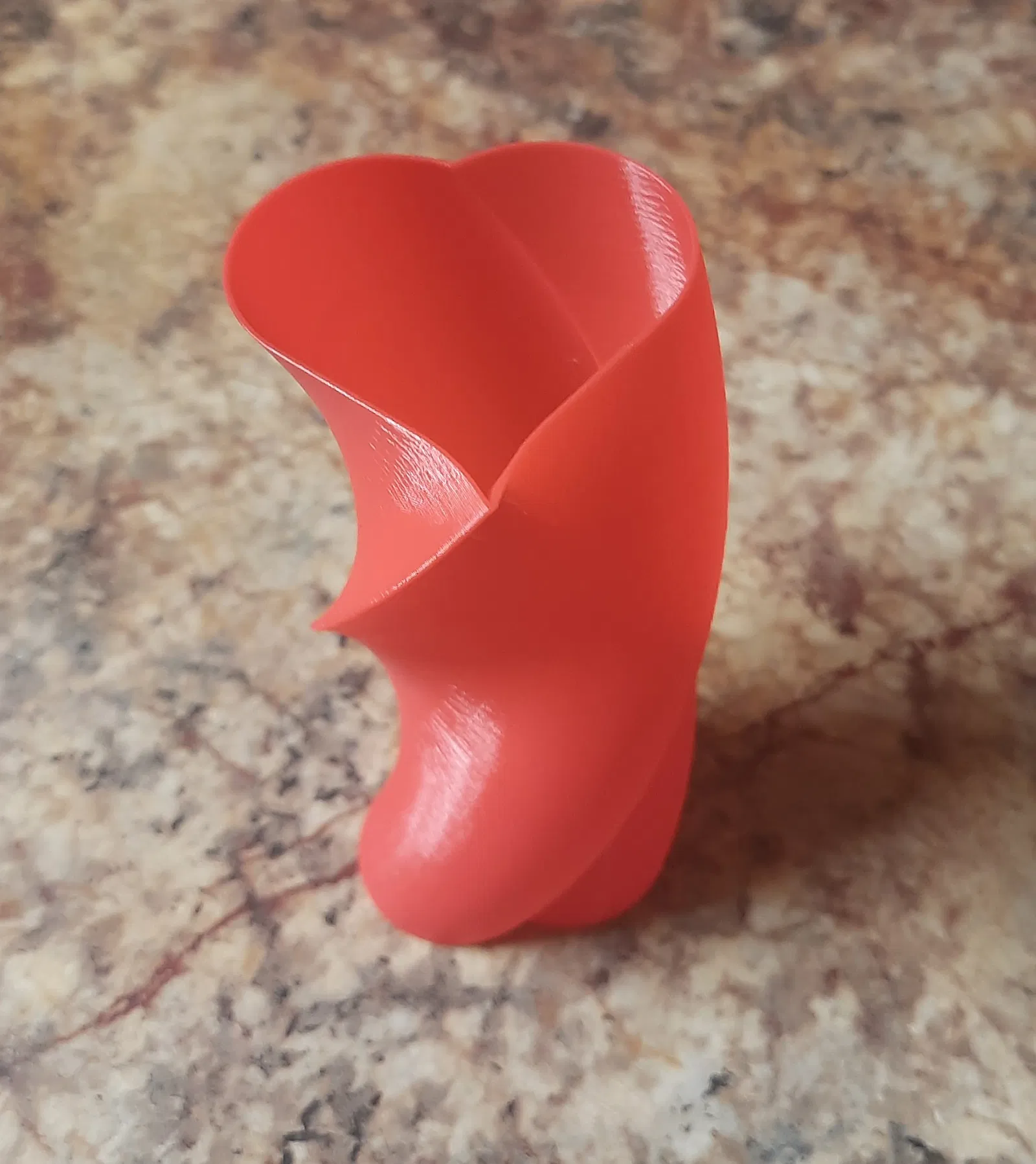 Mẫu bình hình trái tim xoắn ốc 180° bao gồm độ dày 3 lớp tường với đầu phun .4mm, và phiên bản đặc (như hình) in ở chế độ "vase mode" xoắn ốc, đạt được bằng cách in với đầu phun .4 mm nhưng cắt lát cho đầu phun .6mm.