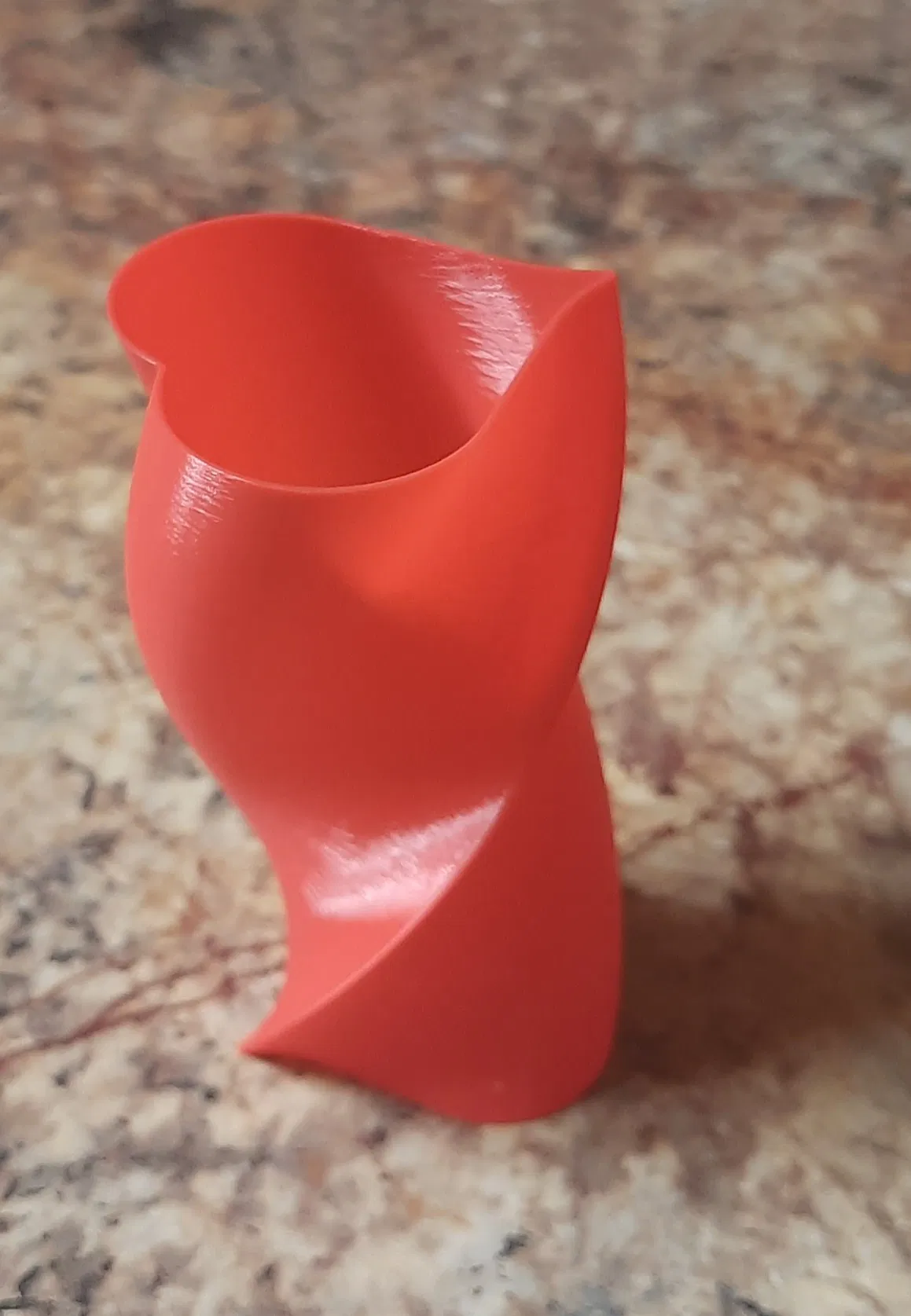 Mẫu bình hình trái tim xoắn ốc 180° này có độ dày 3 lớp tường, dùng đầu phun .4mm. Phiên bản đặc được in ở chế độ "vase mode" xoắn ốc, đạt được bằng cách in với đầu phun .4 mm nhưng cắt lát cho đầu phun .6mm. Thích hợp cho ngày Valentine!