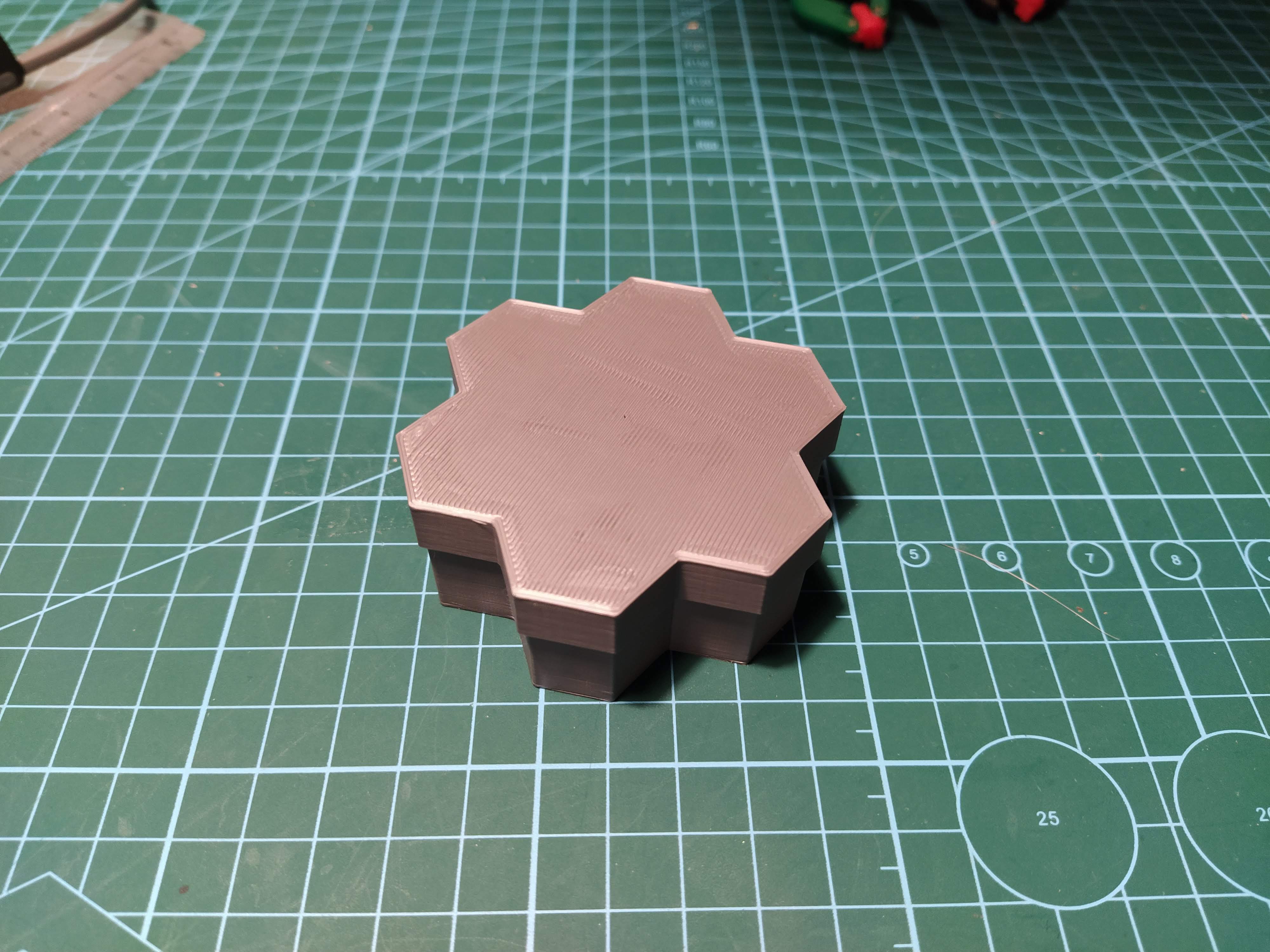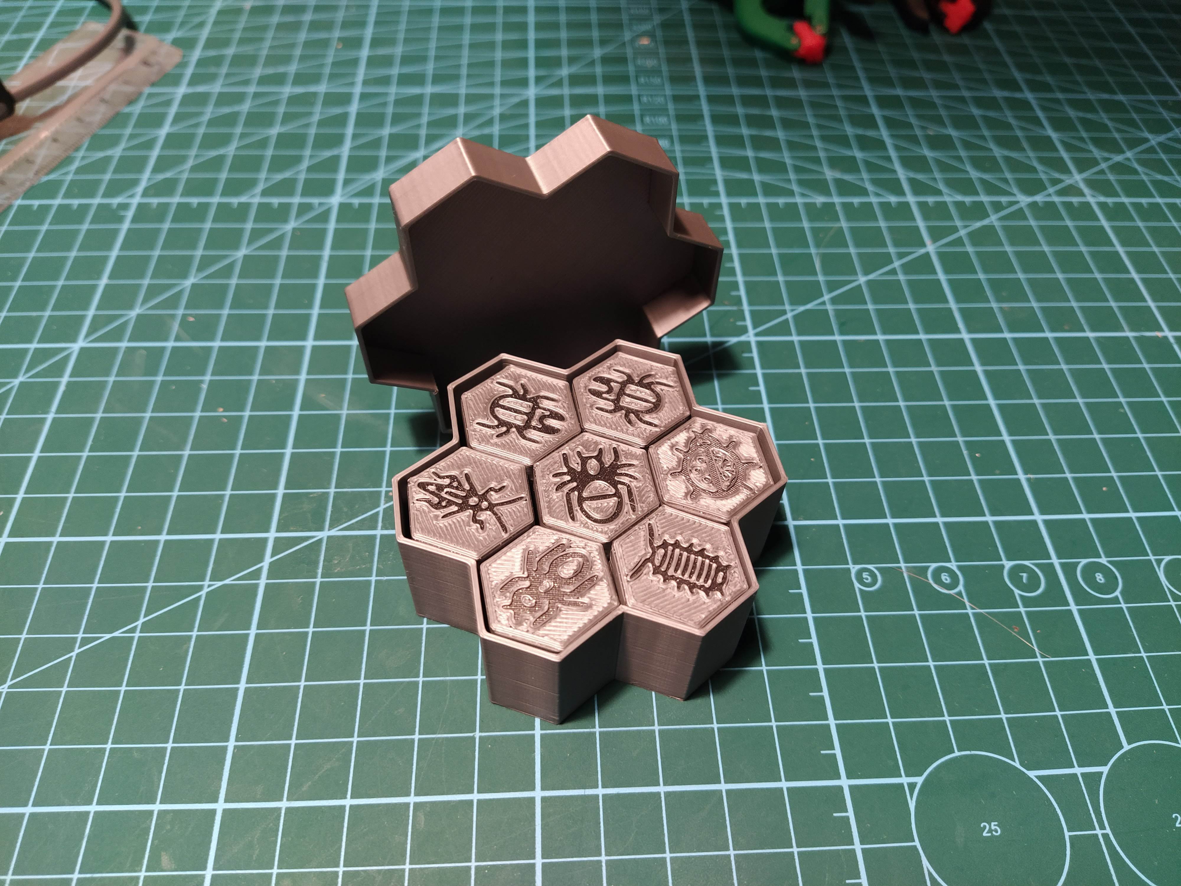 Chào mọi người, Đây là cái hộp dành cho bàn cờ Hive in ở tỉ lệ 50%. Trò này hay lắm, tui muốn có bản chơi nhỏ gọn để bỏ túi luôn. Nên tui in nguyên bộ ở tỉ lệ 50%, giờ mấy con cờ lục giác chỉ còn khoảng 20 mm mỗi cạnh. Cái hộp này sẽ vừa y cho 28 con (bộ cơ bản + thêm 2 muỗi, 2 bọ hung và 2 bọ rùa). Tui còn định tự tạo thêm mấy con bọ khác nữa, nên chuẩn bị tinh thần nha! In bằng chế độ 0.25mm DRAFT với nozzle 0.4mm, chất liệu PLA, và đẩy tốc độ hết cỡ trên máy in (#gotagofast), tốn 20 phút cho hộp và 10 phút cho nắp. _Mấy con cờ là tui lấy từ thingiverse, nhưng chắc cũng giống mấy cái này: