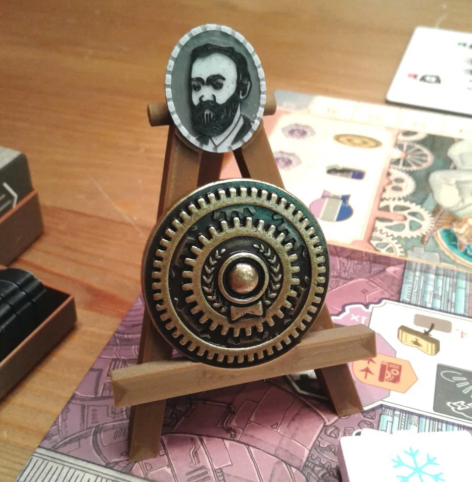 Trời ơi, Giải Nobel đó! Ai lại đi đặt Giải Nobel xuống bàn... Đây là một cái đế để trưng bày Giải Nobel của board game Weather Machine, có chân dung Alfred Nobel. Đế này có thể gấp lại gọn gàng.