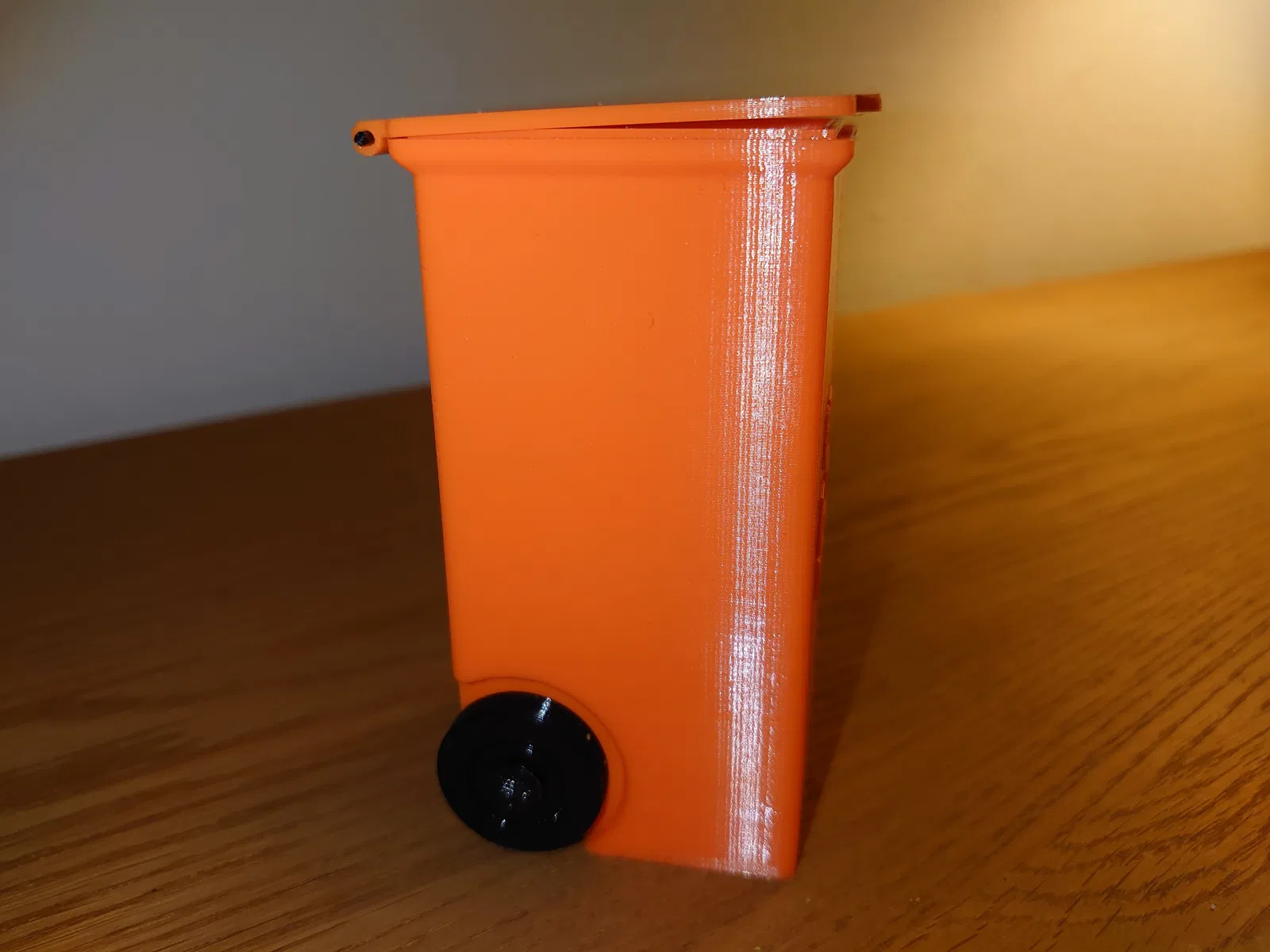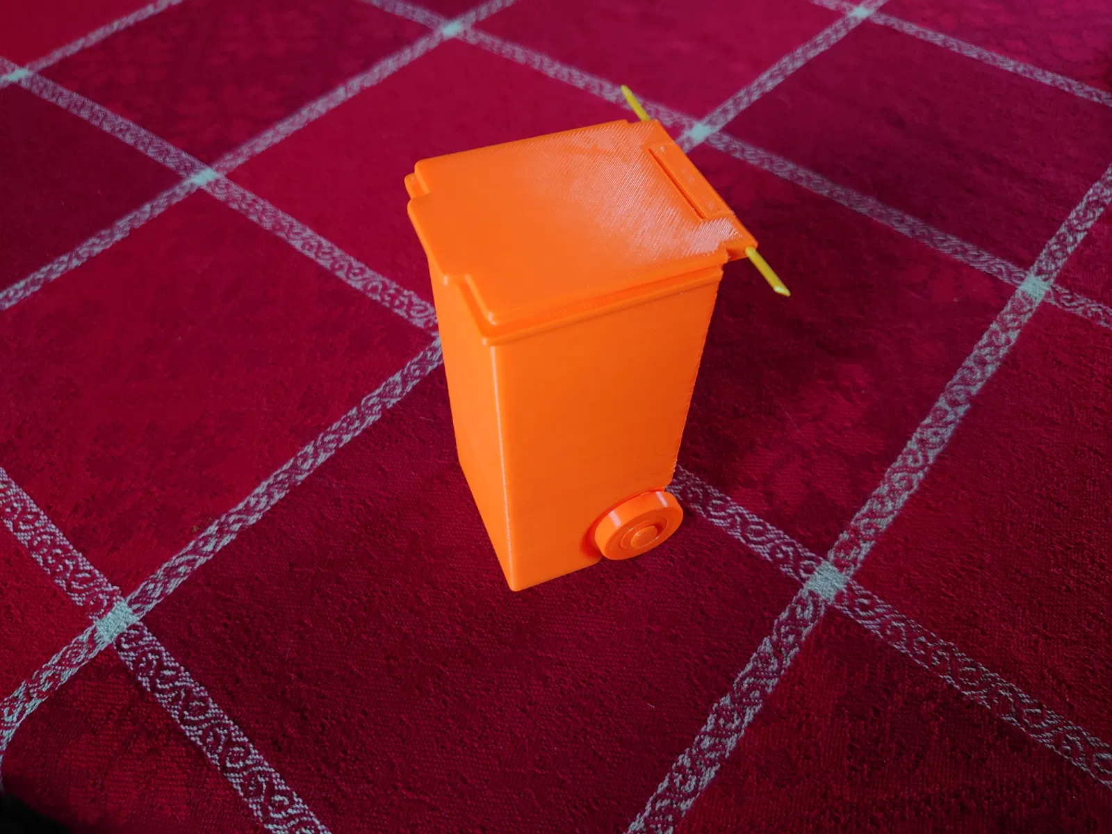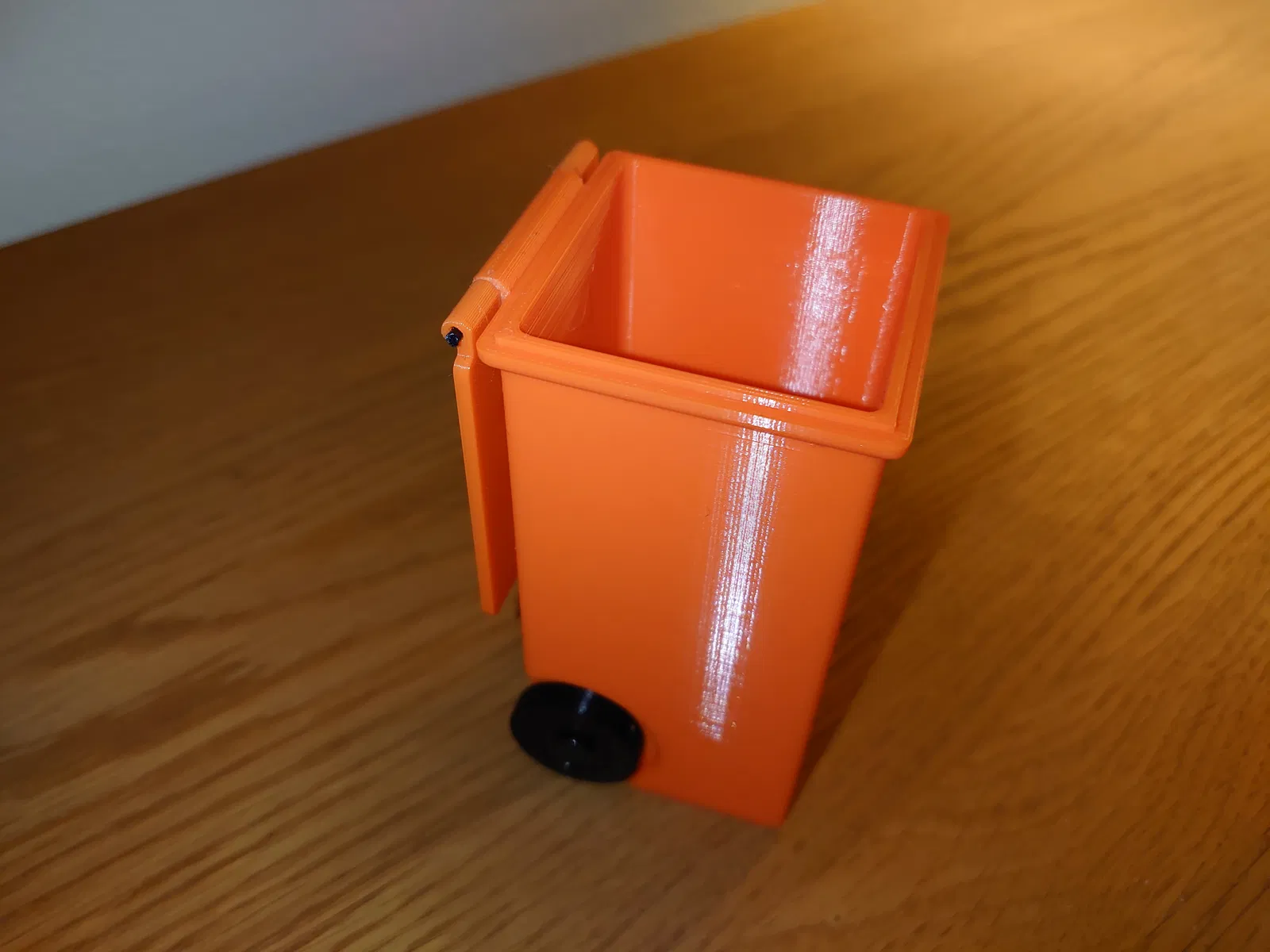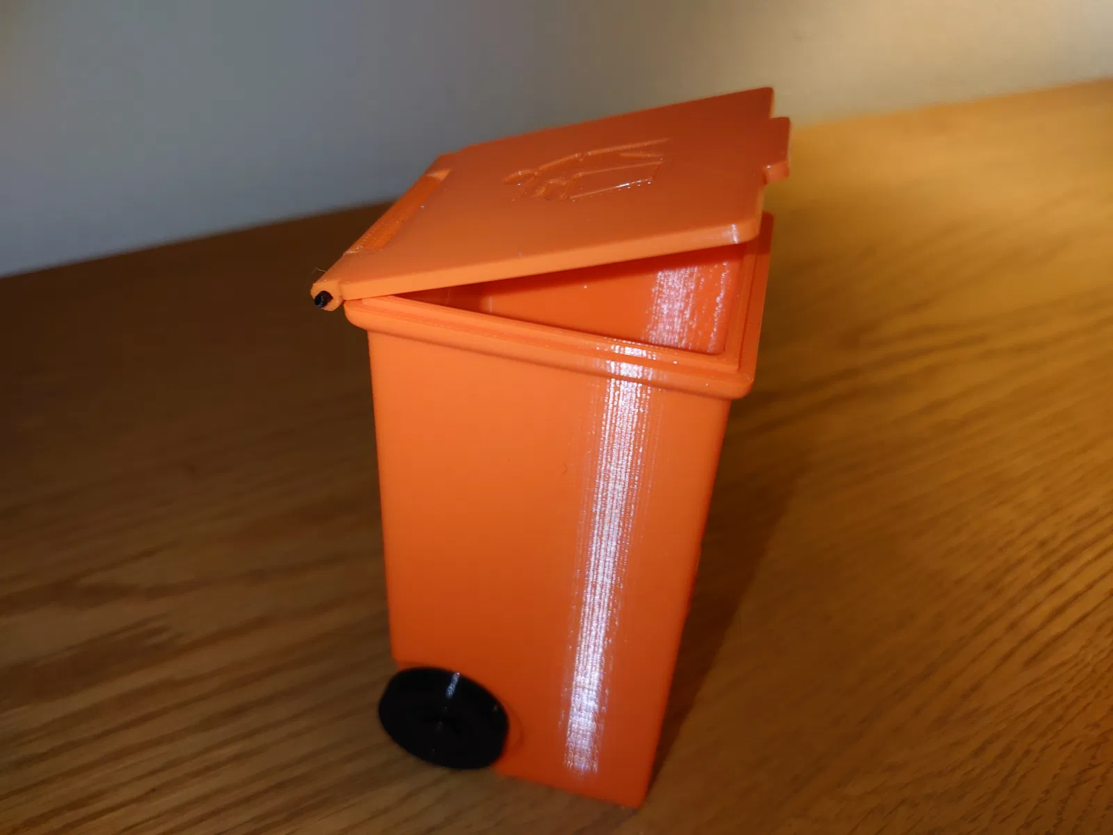 Nắp được gắn vào thùng rác bằng một đoạn dây filament, có thể hơi khó gắn nhưng sẽ vừa. Đường kính lỗ trên nắp là 2mm và lỗ trên thùng là 2.2mm. Dây filament là 1.75mm nhưng khi in theo chiều ngang thì kết quả sẽ vừa khít với dây filament 1.75mm.