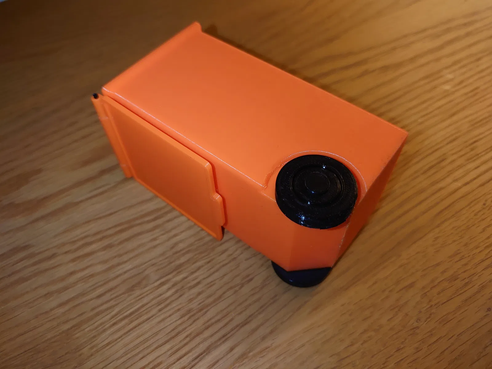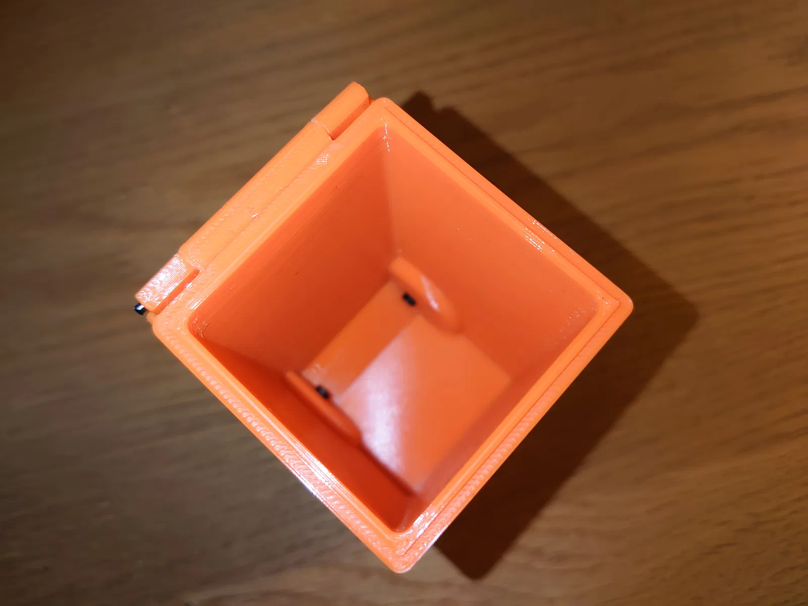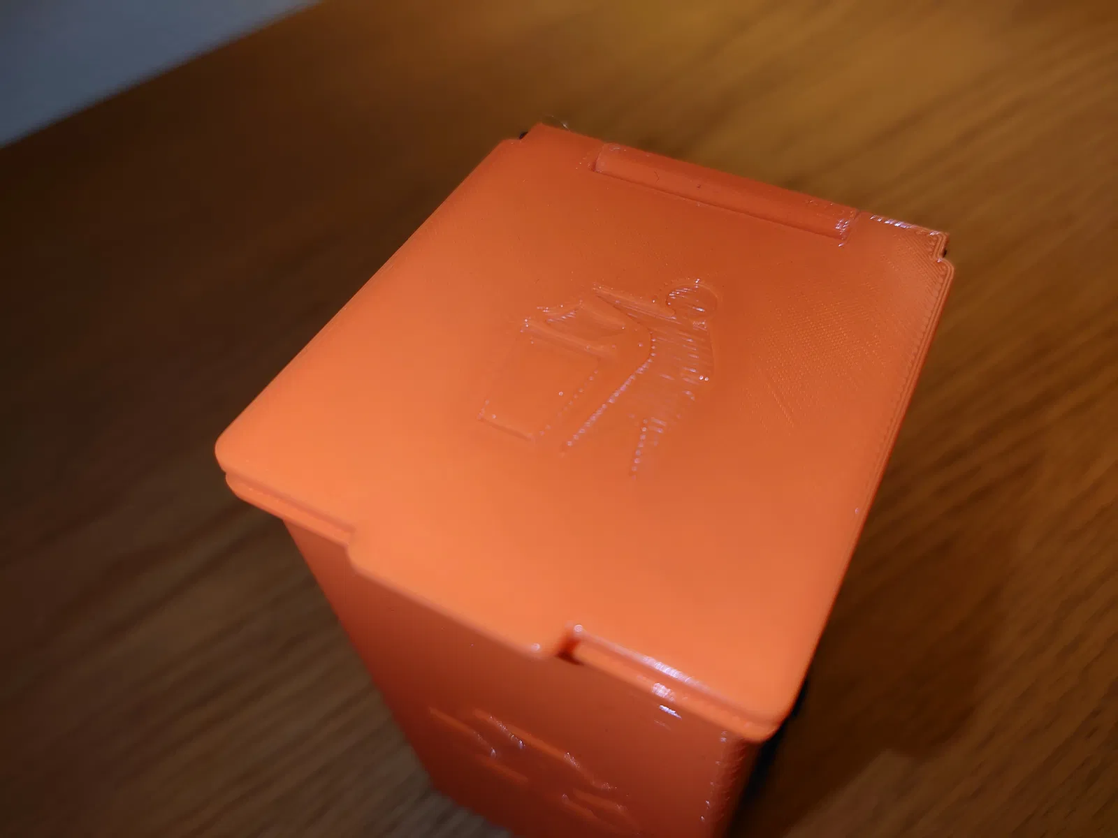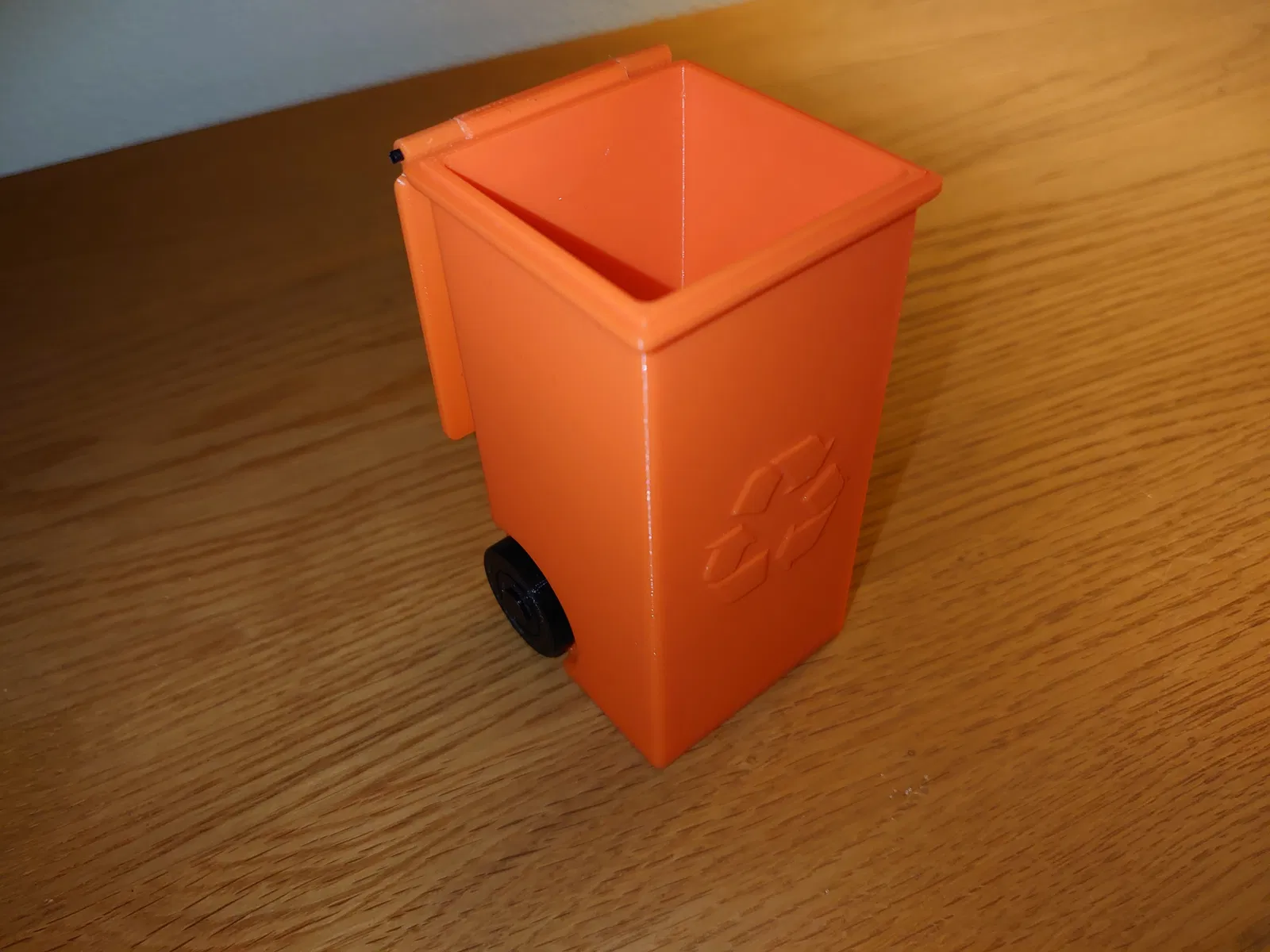 Nắp được gắn vào thùng rác bằng một đoạn dây filament, có thể hơi khó gắn nhưng sẽ vừa. Đường kính lỗ trên nắp là 2mm và lỗ trên thùng là 2.2mm. Dây filament là 1.75mm nhưng khi in theo chiều ngang thì kết quả sẽ vừa khít với dây filament 1.75mm.