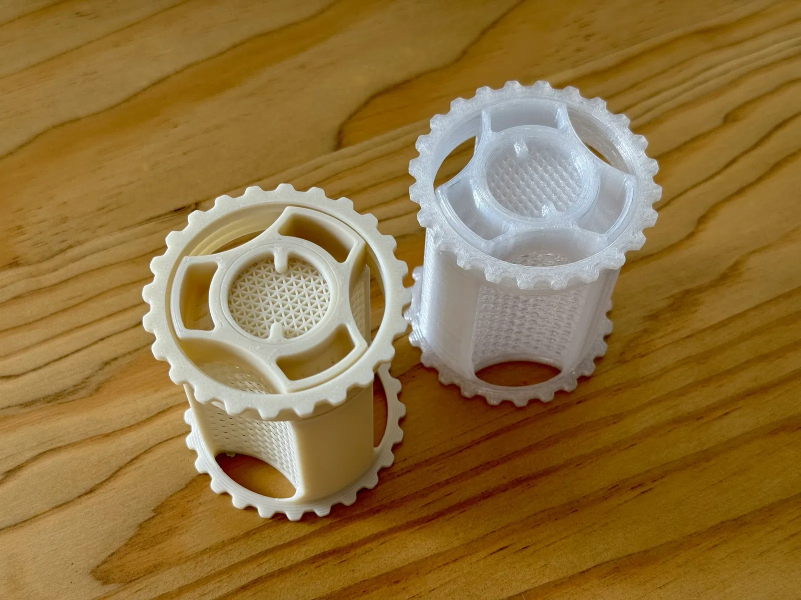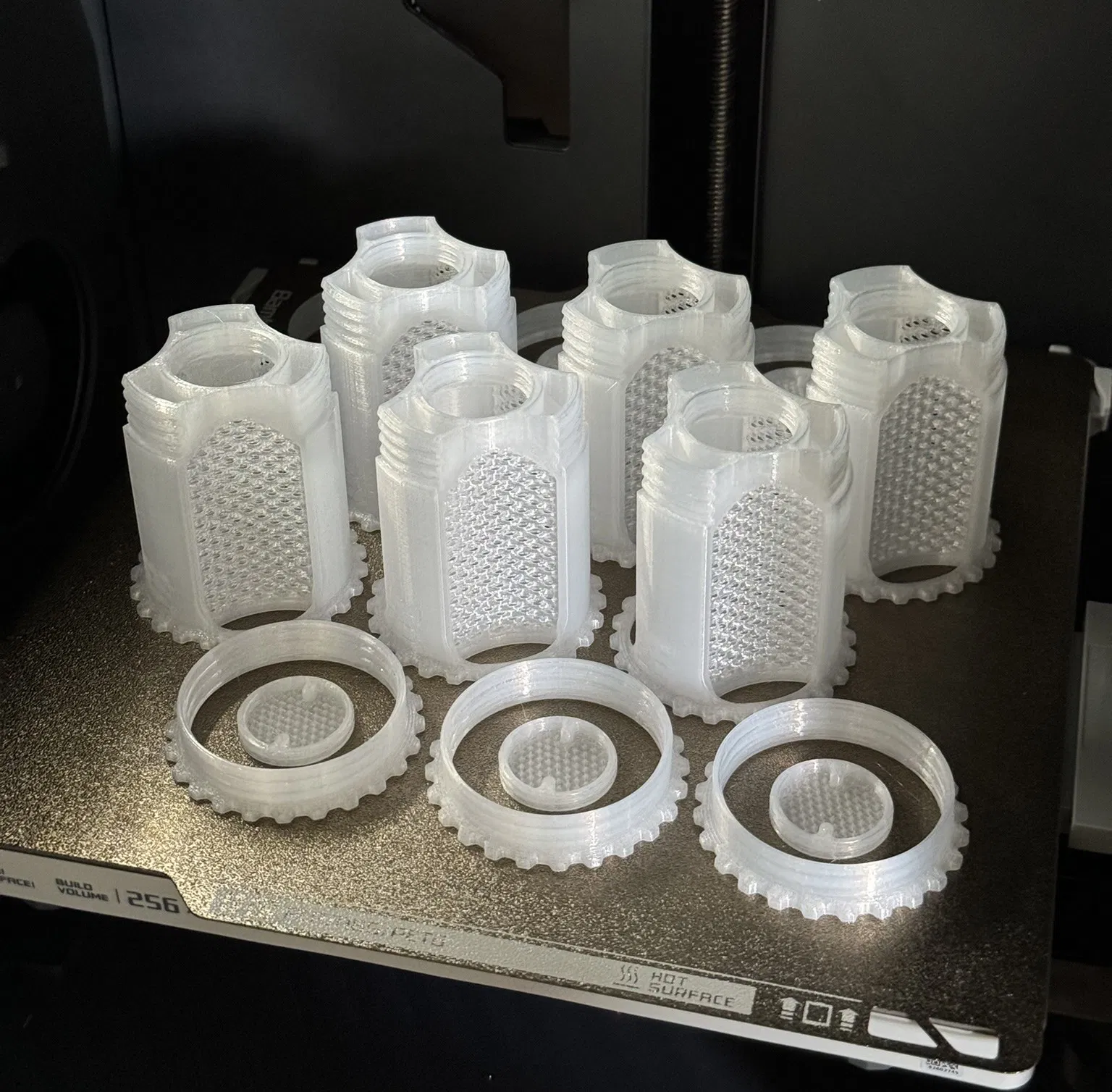 Tui in cái của tui bằng nhựa Polycarbonate trong suốt, in dễ ơi là dễ vì không có mấy cái vách thẳng dài làm cong vênh. Nhựa ASA cũng là một lựa chọn tốt nhưng tui chọn Polycarbonate để tui có thể thấy màu của hạt hút ẩm đang báo hiệu mà không cần mở nắp hộp ra.