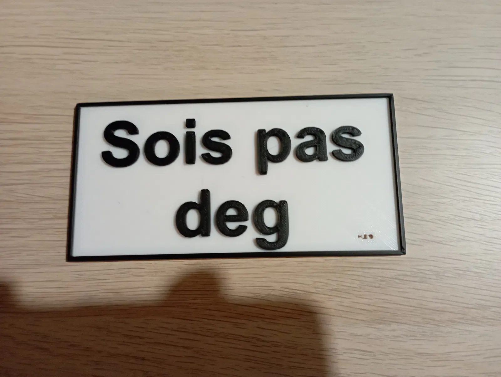 Một cái đĩa đơn giản, có khắc dòng chữ "sois pas deg" theo kiểu troll vui nhộn. Thích hợp để làm quà tặng độc đáo hoặc trang trí bàn làm việc.