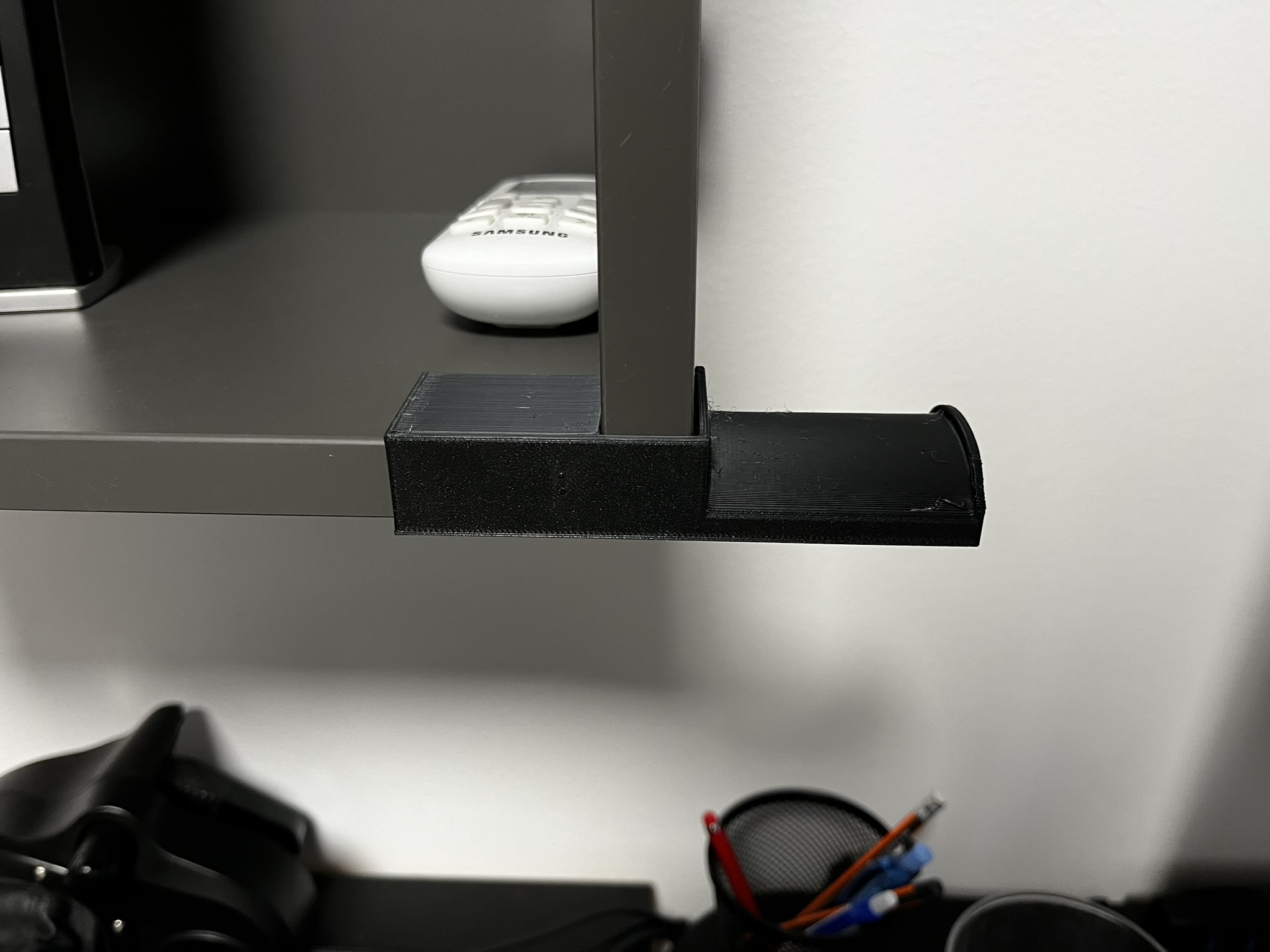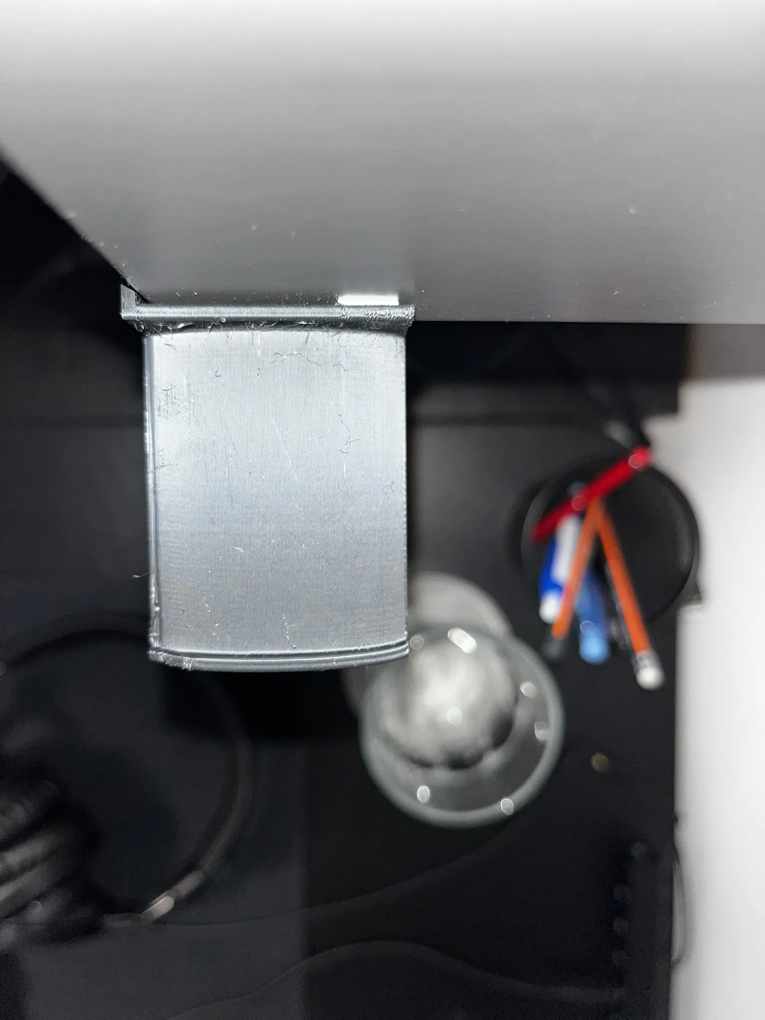 Cái giá đỡ đơn giản chỉ cần trượt vào. Tôi khuyên bạn nên dán băng dính hai mặt ở phía bên phải như trong hình thứ ba. In theo chiều mà nó đang có. Không cần hỗ trợ.