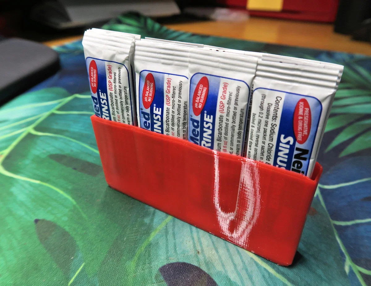 Cái đế đựng gói Neilmed này giúp bạn cất giữ các gói thuốc rửa mũi Neilmed một cách gọn gàng, tiện lợi khi đi du lịch. Nó có thể dễ dàng chứa 12 gói. Nếu in bằng TPU, bạn có thể ép thêm một gói vào mỗi khe, tổng cộng là 16 gói. Tôi đã in của tôi bằng TPU.