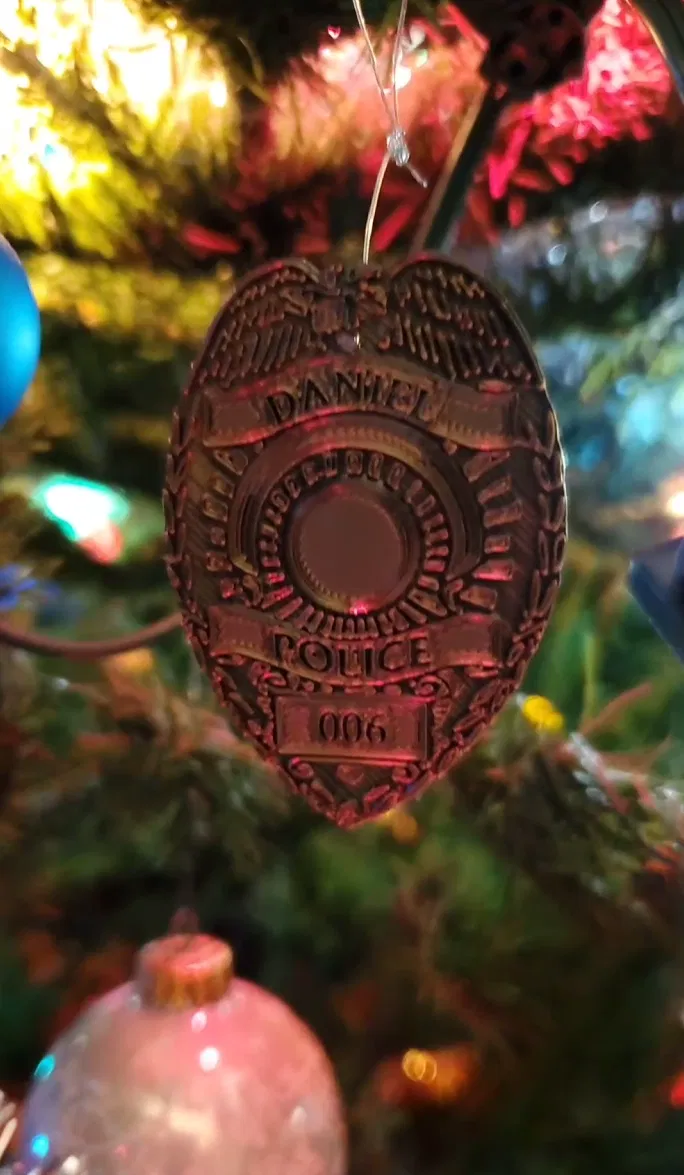 Mô hình huy hiệu Cảnh sát Daniel, được làm riêng cho em trai làm đồ trang trí Noel. Thêm tên và khu cảnh sát. Có thể in đặt phẳng, tùy chỉnh kích thước cho dày hơn.
