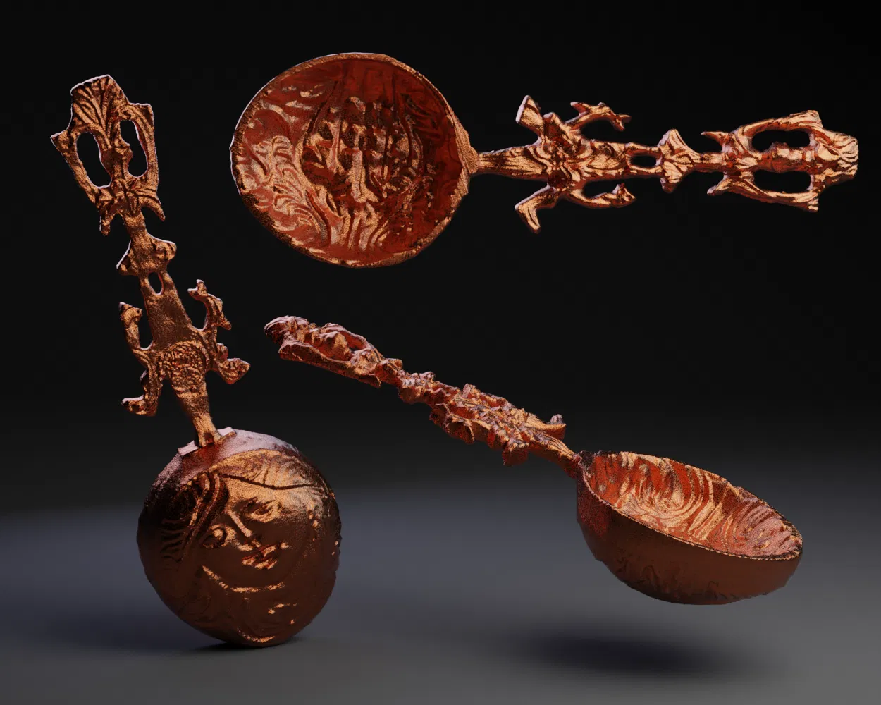 Phần lõm của chiếc muỗng hiển thị một loại trái cây yêu thích và hiếm, được chạm khắc theo phong cách đương đại.
