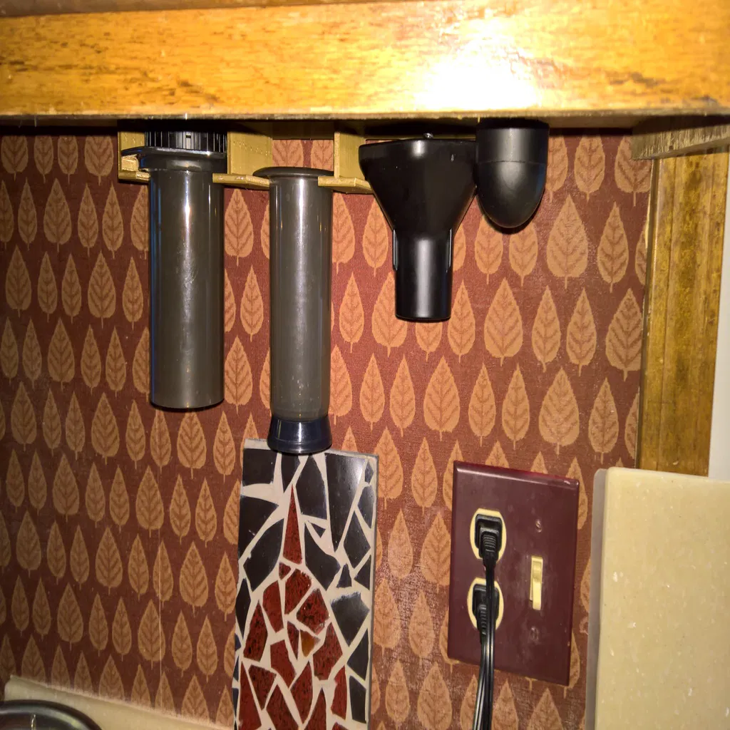 Tui lấy ý tưởng từ nhiều cái giá đỡ và bộ tổ chức Aeropress khác nhau để làm ra cái này, gắn ở dưới gầm tủ. Tui in bằng Ender 5 Plus. Nếu bạn nào không đủ không gian in, tui đã chia nhỏ ra làm hai phần. Tui dùng vít gỗ loại ngắn để bắt vô tủ nha.
