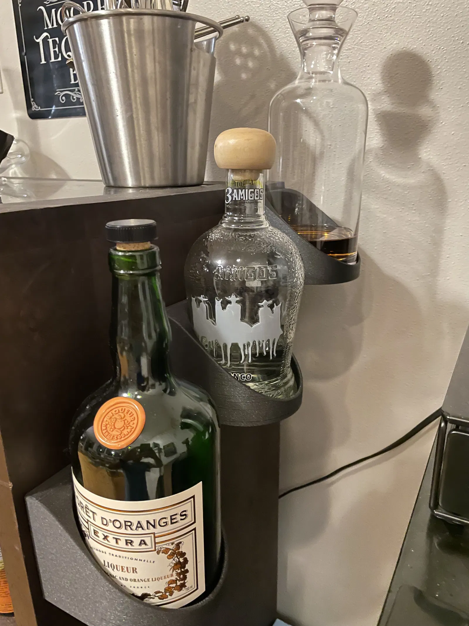 Đây là một dự án vui mà tôi nảy ra do nhu cầu thực tế. Tôi có một quầy bar rất nhỏ với không gian để chai lọ hạn chế và cuối cùng đã hết chỗ. Tôi đã thêm những cái này để mở rộng không gian lưu trữ mà không chiếm diện tích mặt bàn và chúng hoạt động tuyệt vời. Sau đó, tôi cũng đã lắp chúng vào văn phòng/phòng thí nghiệm/nơi làm việc của mình.