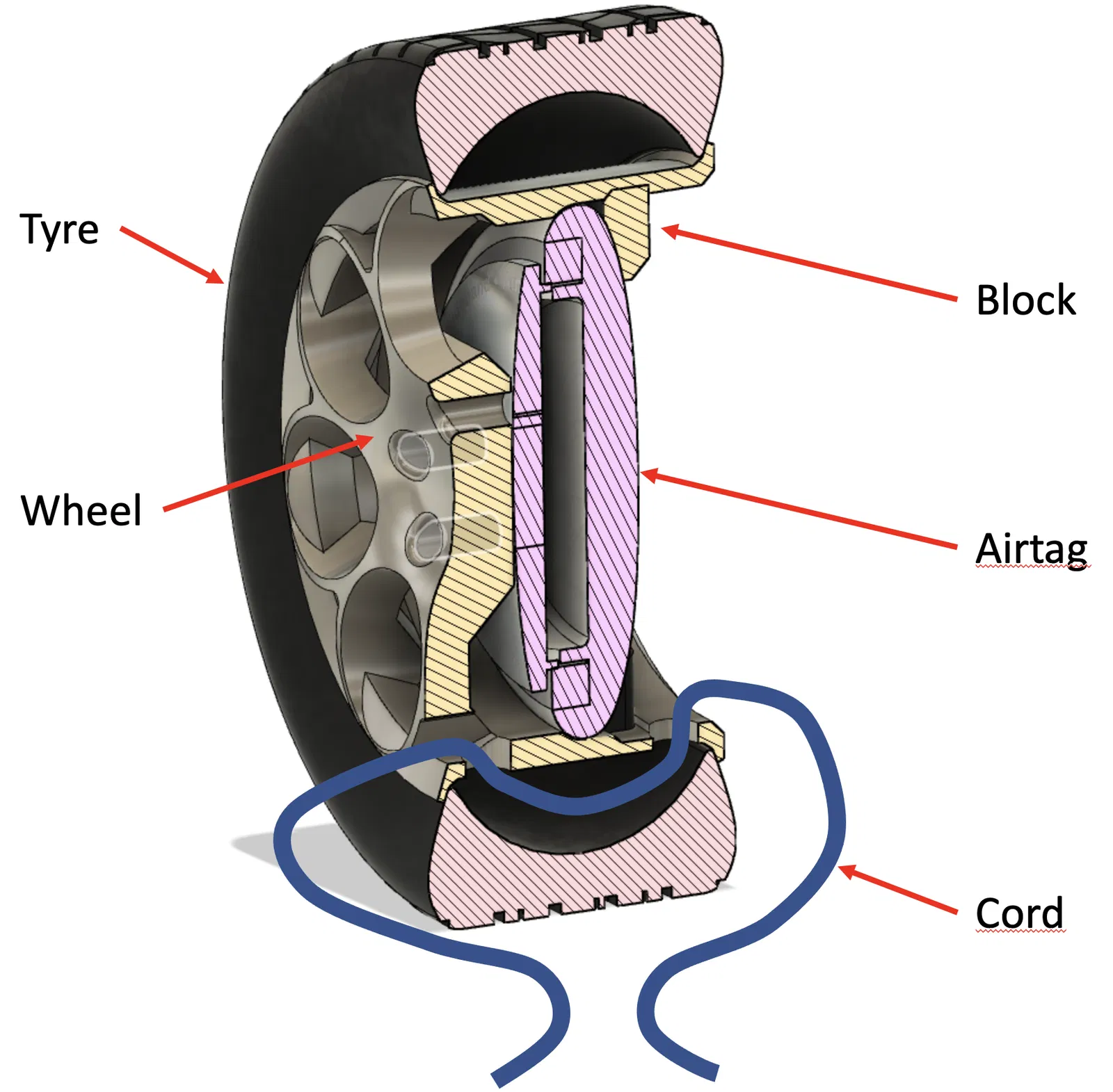 Để lắp ráp, hãy nhét AirTag vào bên trong Wheel và khóa bằng Ring. Ring có hai lỗ để có thể dùng kềm làm biến dạng rồi gắn vào rãnh của Wheel. Luồn dây qua hai lỗ lớn của Wheel rồi đóng lại bằng Tire. Cá nhân tôi đã đảm bảo nút thắt của dây nằm bên trong Tire, tiếp xúc với Wheel.