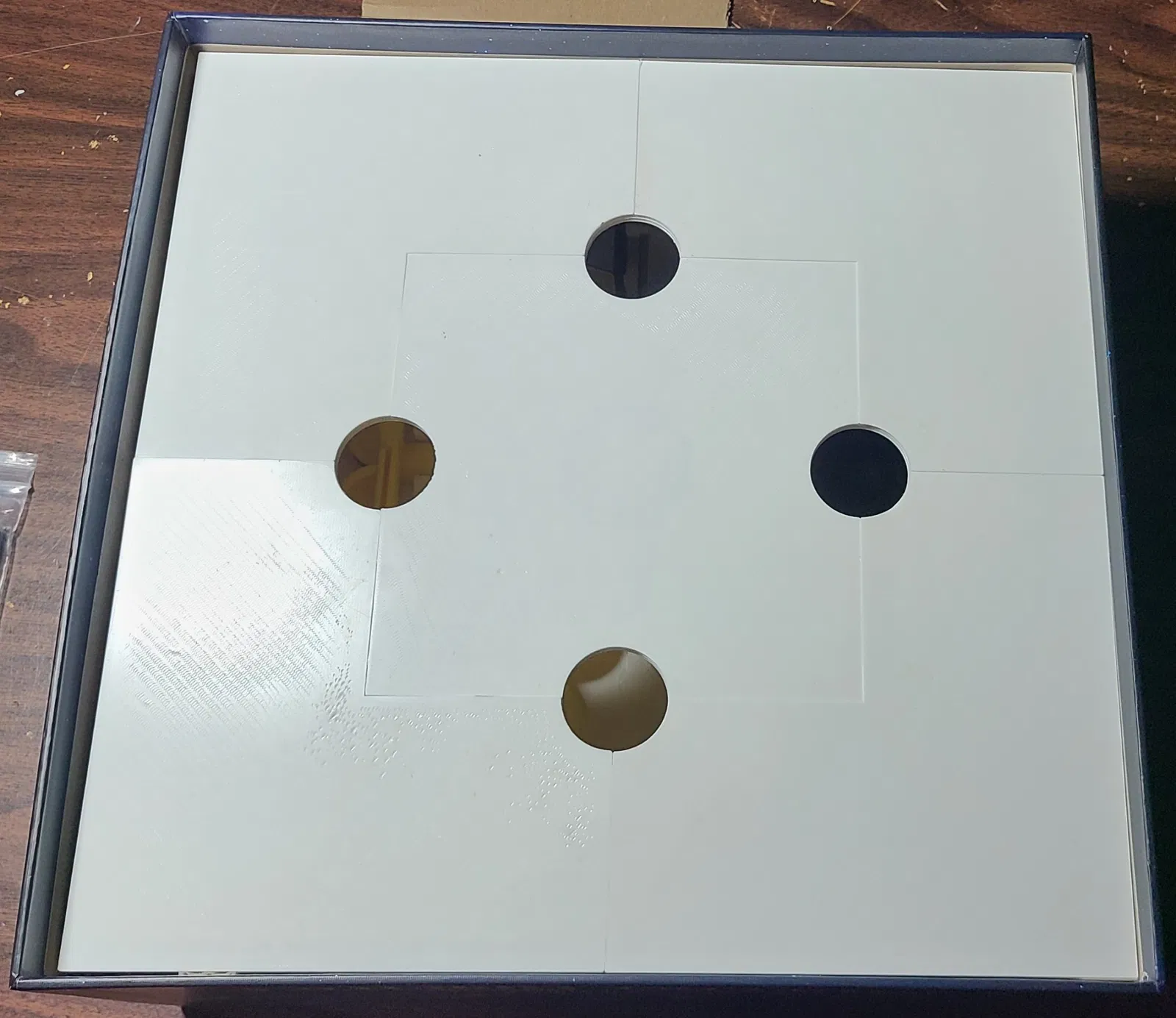- Đối với khay tài liệu, bạn sẽ cần sử dụng một bề mặt phẳng để dán các phần lại với nhau. Điều này tạo ra một khối cứng. Lưu ý rằng khay là không đối xứng do việc lưu trữ sách gian lận ở một bên. Các tấm nối sẽ sử dụng các lỗ và chốt để căn chỉnh và toàn bộ sẽ đủ cứng sau khi được dán siêu dính lại với nhau. Lưu ý rằng các tấm nối A-B và C-D là giống hệt nhau, nhưng các tấm nối B-C và D-A thì không, chúng là hình ảnh phản chiếu.