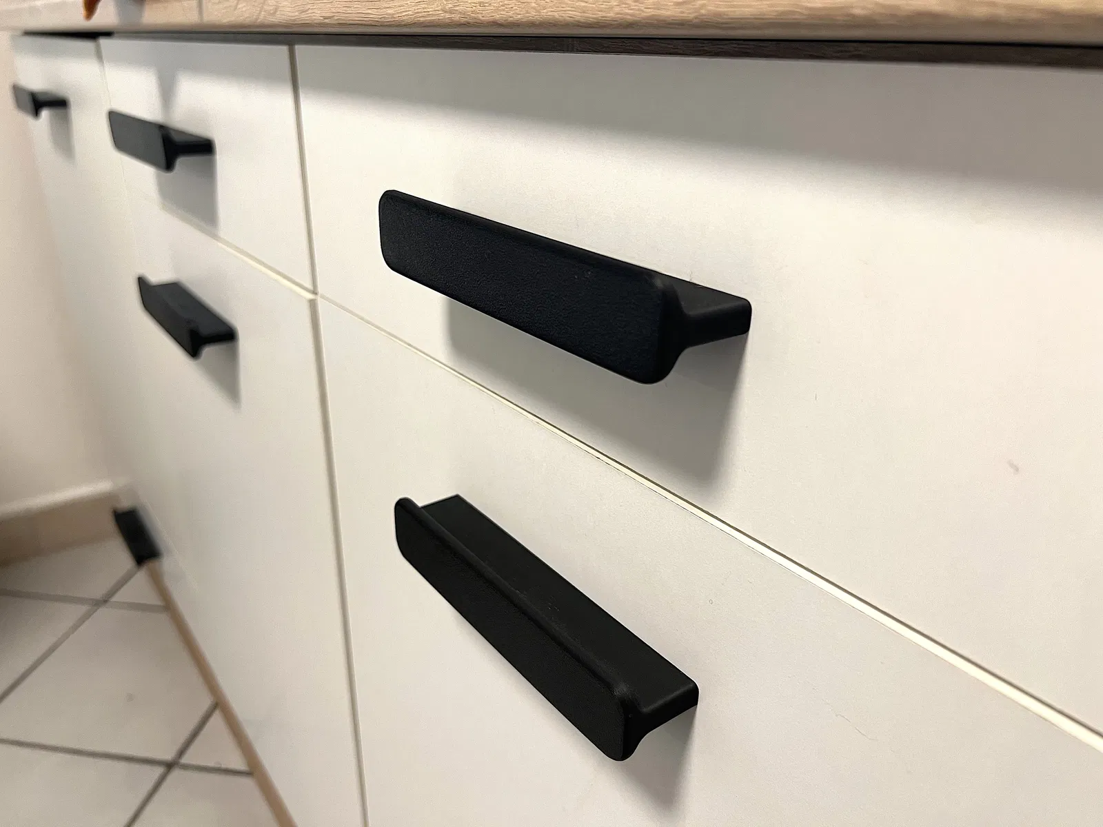 Tay nắm cửa bếp kiểu IKEA, có 3 kích thước 96mm, 128mm, 160mm. Đảm bảo đo đúng khoảng cách lỗ trước khi in. Sử dụng ốc vít gỗ 4mm. In bằng PLA mờ và bề mặt PEI nhám sẽ cho ra thành phẩm đẹp mắt, khó ai nhận ra là đồ in 3D.
