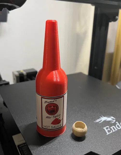Tôi làm cái này cho khu bếp đồ chơi của mấy đứa nhỏ nhà tôi. Tôi in chai tương ớt bằng sợi màu đỏ, còn cái nắp thì bằng sợi màu gỗ. In ra xài ngon lành và nhìn là nhận ra ngay chai tương ớt kiểu này rồi, nhưng mà tôi cũng khuyên là nên dán thêm cái nhãn tùy chỉnh bằng sticker nữa cho đẹp.