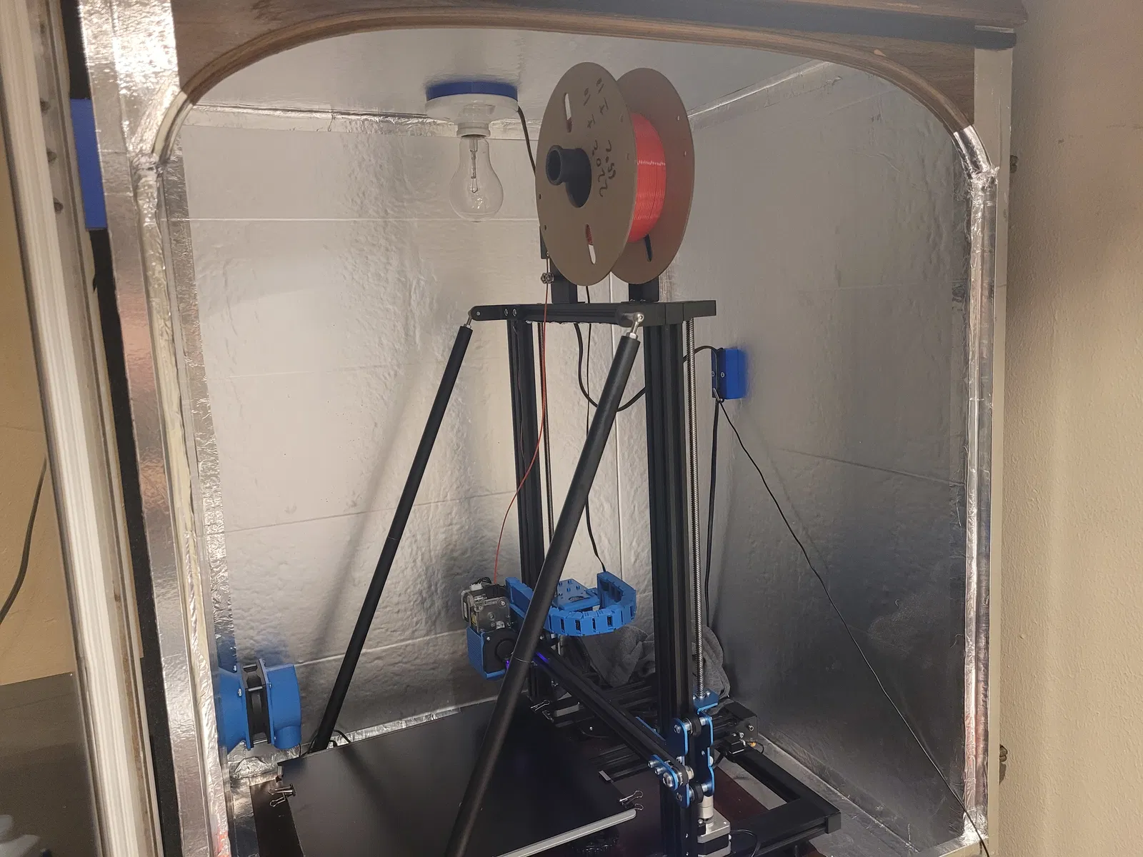 Bóng đèn sợi đốt 150W làm nóng vỏ máy, và công tắc nhiệt KSD301 TẮT ở khoảng 58°C và BẬT ở khoảng 48°C. Giữ nhiệt độ vỏ máy đủ ấm để in ABS. Tôi cá đây là cách rẻ nhất để làm ấm. Và cũng chiếu sáng bên trong vỏ máy SIÊU sáng.