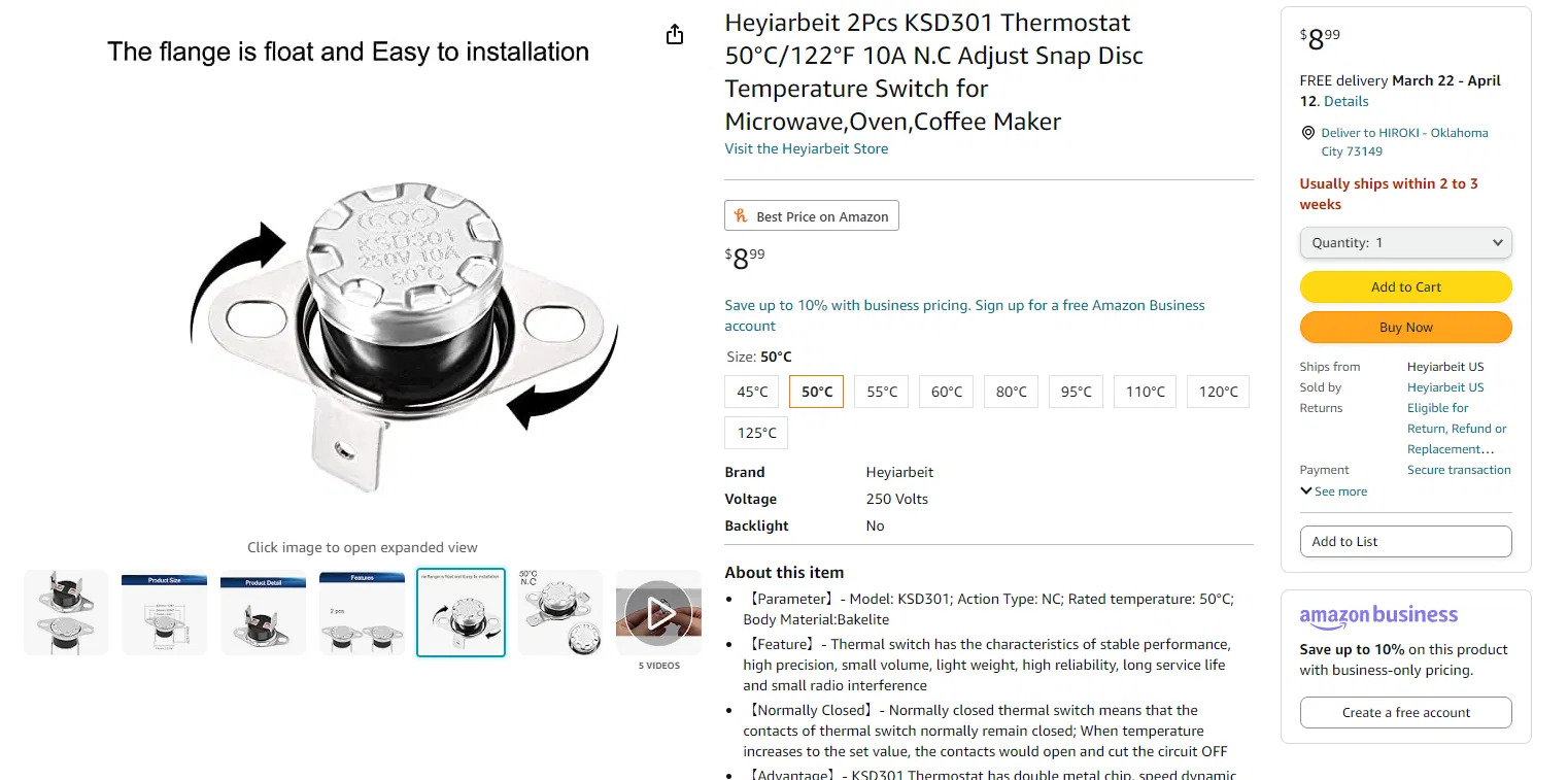 1 x Rơ le nhiệt KSD301 50°C/122°F 10A N.C $9 https://www.amazon.com/gp/product/B09L5MZJ6R/ref=ppx_yo_dt_b_search_asin_title?ie=UTF8&th=1
