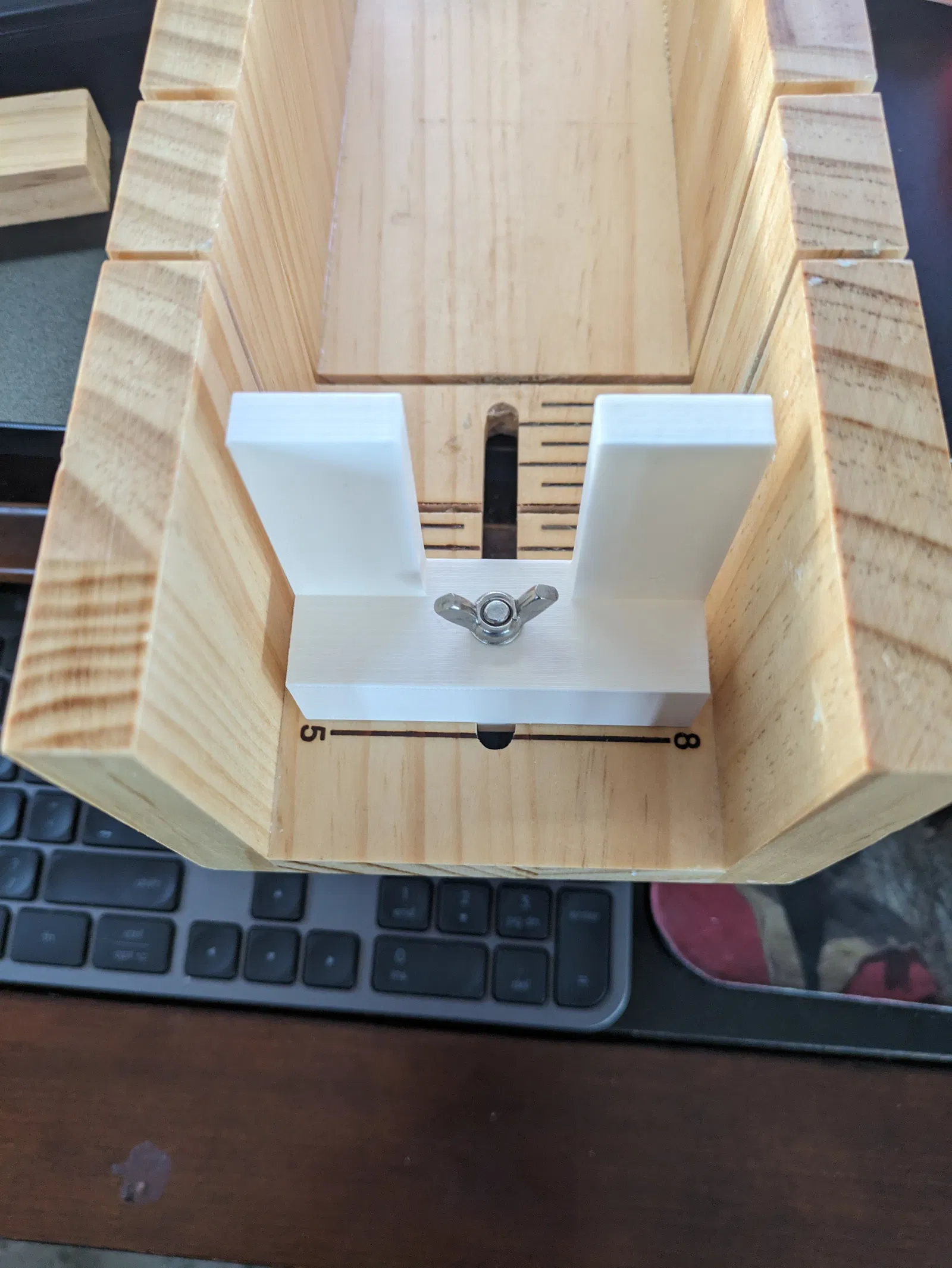 Cái khối chỉnh độ rộng cho dao cắt xà bông bằng gỗ bị xoay và không làm tròn nhiệm vụ. Tôi đã mô hình hóa bộ phận giữ bánh xà bông thay thế này, hoạt động tốt hơn nhiều. Có 2 phiên bản: V2 cao để tì vào cả bánh xà bông, V3 y hệt bản gốc với các núm giữ cho thẳng. In với hỗ trợ cho phần núm và chặn hỗ trợ cho lỗ bu lông.