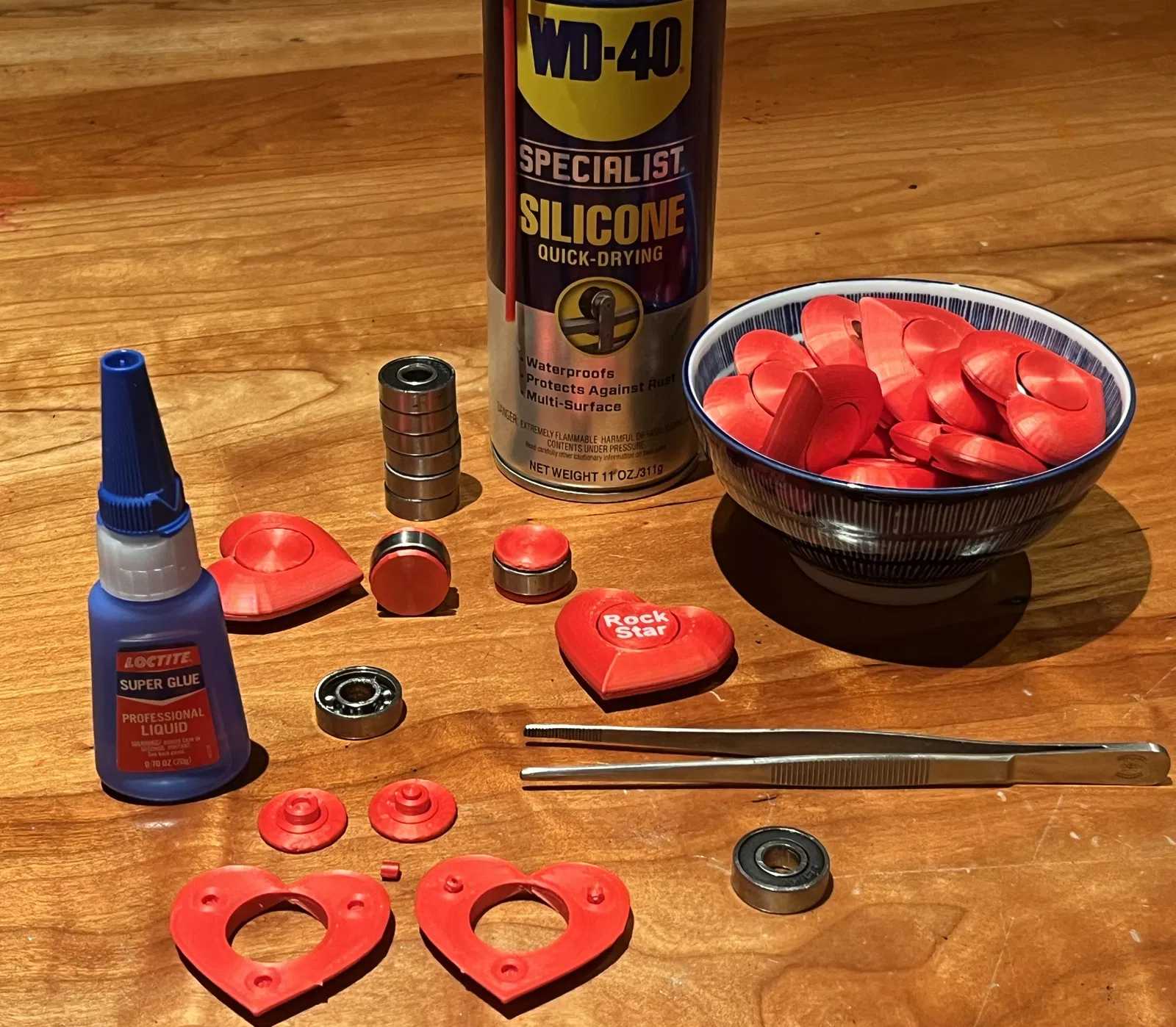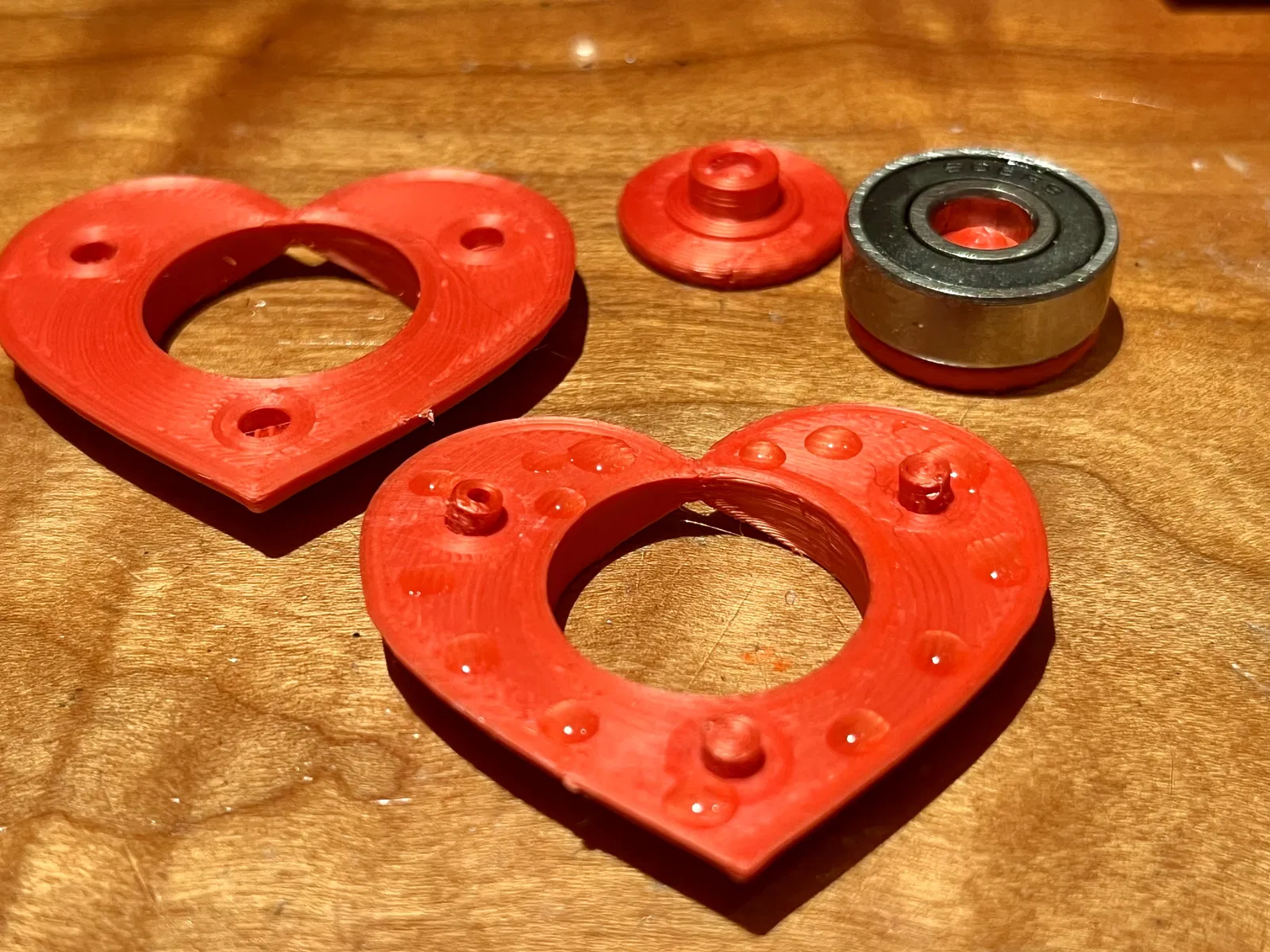 Lắp ráp 2 nửa trái tim lại với nhau bằng các chốt và vài giọt keo siêu dính. Đối với vòng bi, tui cạy lớp nắp chống bụi bằng nhựa đen ra, dùng bàn chải đánh răng và nước rửa chén để loại bỏ mỡ, sau đó xịt một ít bình xịt silicon rồi lắp ráp.