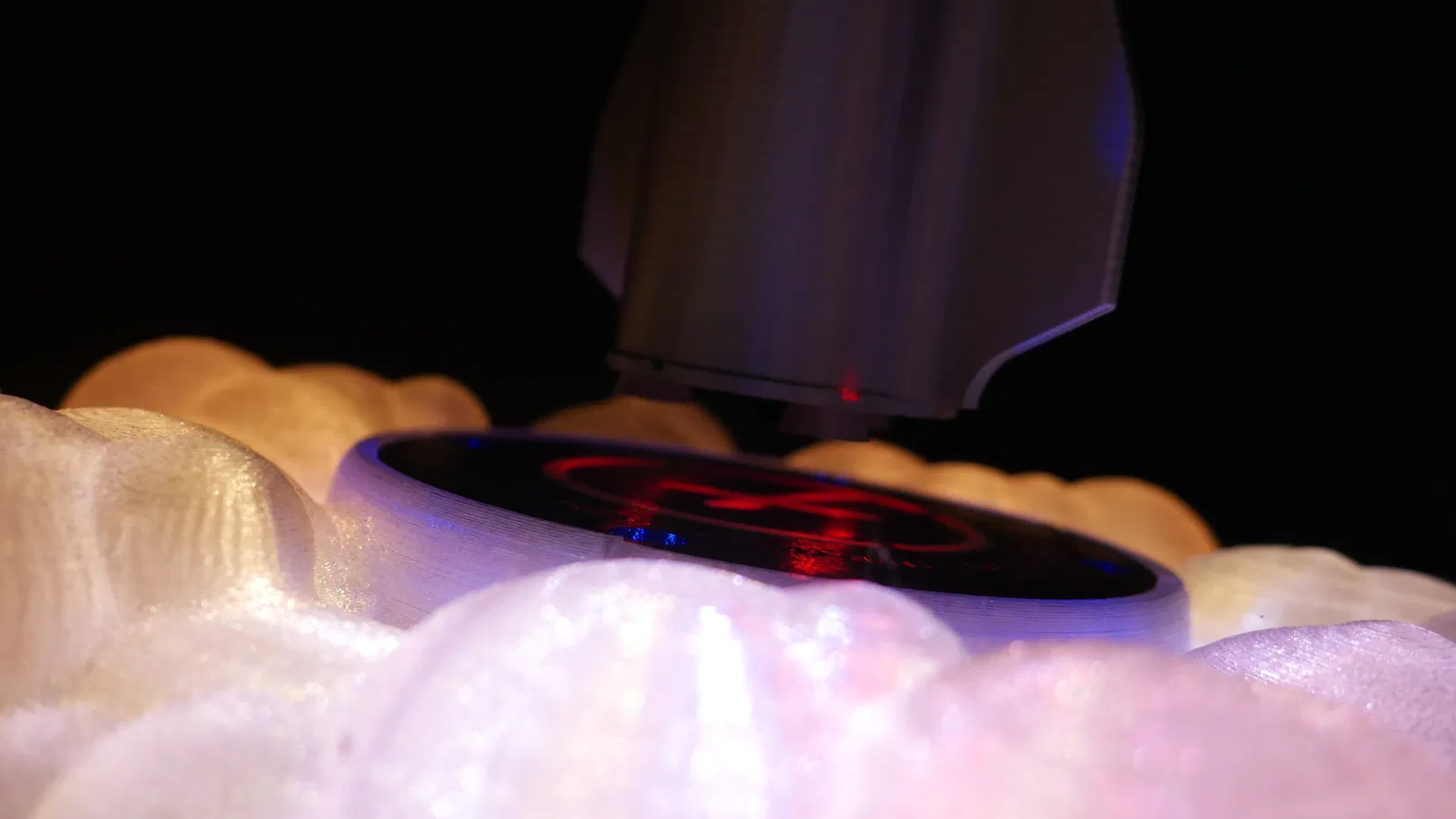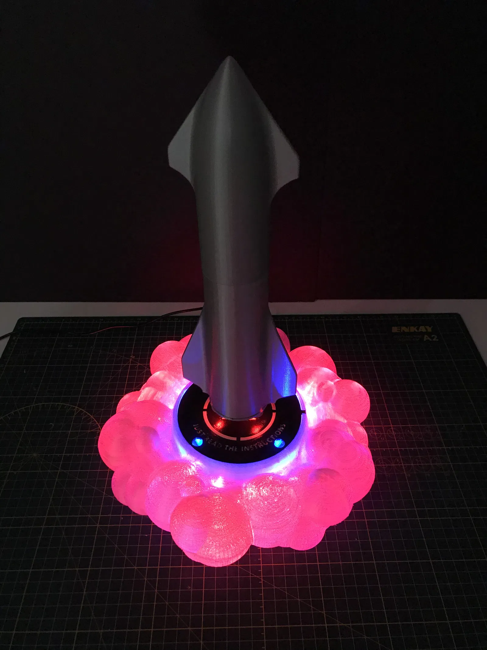 1. Phần đế / bệ phóng... dùng loại PLA trong mờ/trong suốt cho phần khói để tối đa ánh sáng xuyên qua. Mình đã cung cấp các file để bạn ráp nó từ hai nửa trên và dưới, hoặc bốn phần trên và dưới cho những bạn có máy in với kích thước khác nhau. Mình sẽ in phần bệ phóng với màu đặc. Mình đã dùng màu đen với các chi tiết logo 'X' màu trắng.