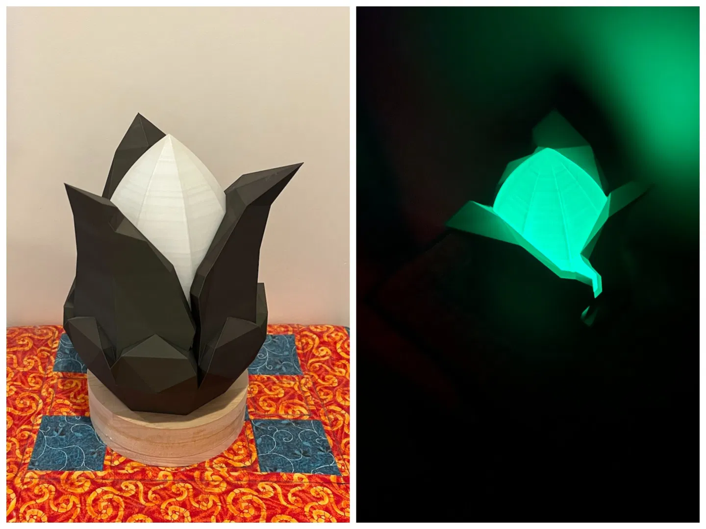 Tui rất hài lòng với kết quả tui có được với sợi Prusament Mystic green PLA (cho phần lá) và sợi AMOLEN glow in the dark green PLA (cho phần chao đèn), như mấy bạn thấy ở đây nè.