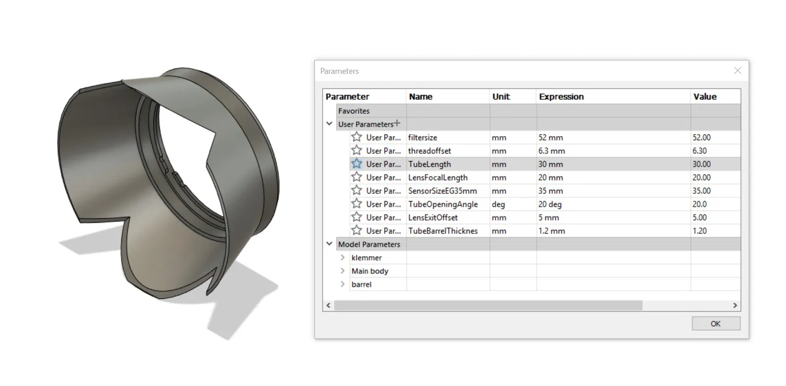 Đừng có nhìn cái file stl nhiều quá ha. Cái file stl chỉ là ví dụ thôi, bạn có thể tùy chỉnh tạo bất kỳ cái chặn sáng ống kính nào bạn muốn với file Fusion 360 đi kèm! Điều chỉnh "Change parameters" và "threadoffset" để vừa khít với ống kính của bạn.