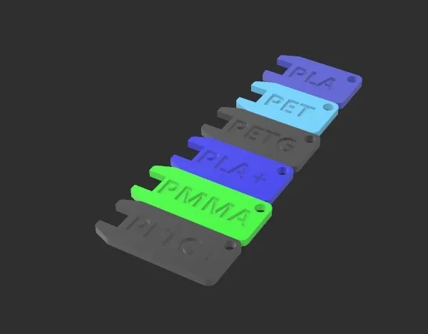 ABS, ASA, CPE, FLEX, FPE, GLO, HD PLA, HIPS, METAL, PA, PC, PCTG, PET, PETG, PETG+ (cao cấp), PLA, PLA+ (cao cấp), PMMA, PP, PVA, SILK, TPE, TPS, TPU, WOOD, XT. Tôi đã thu thập các viết tắt vật liệu tại: