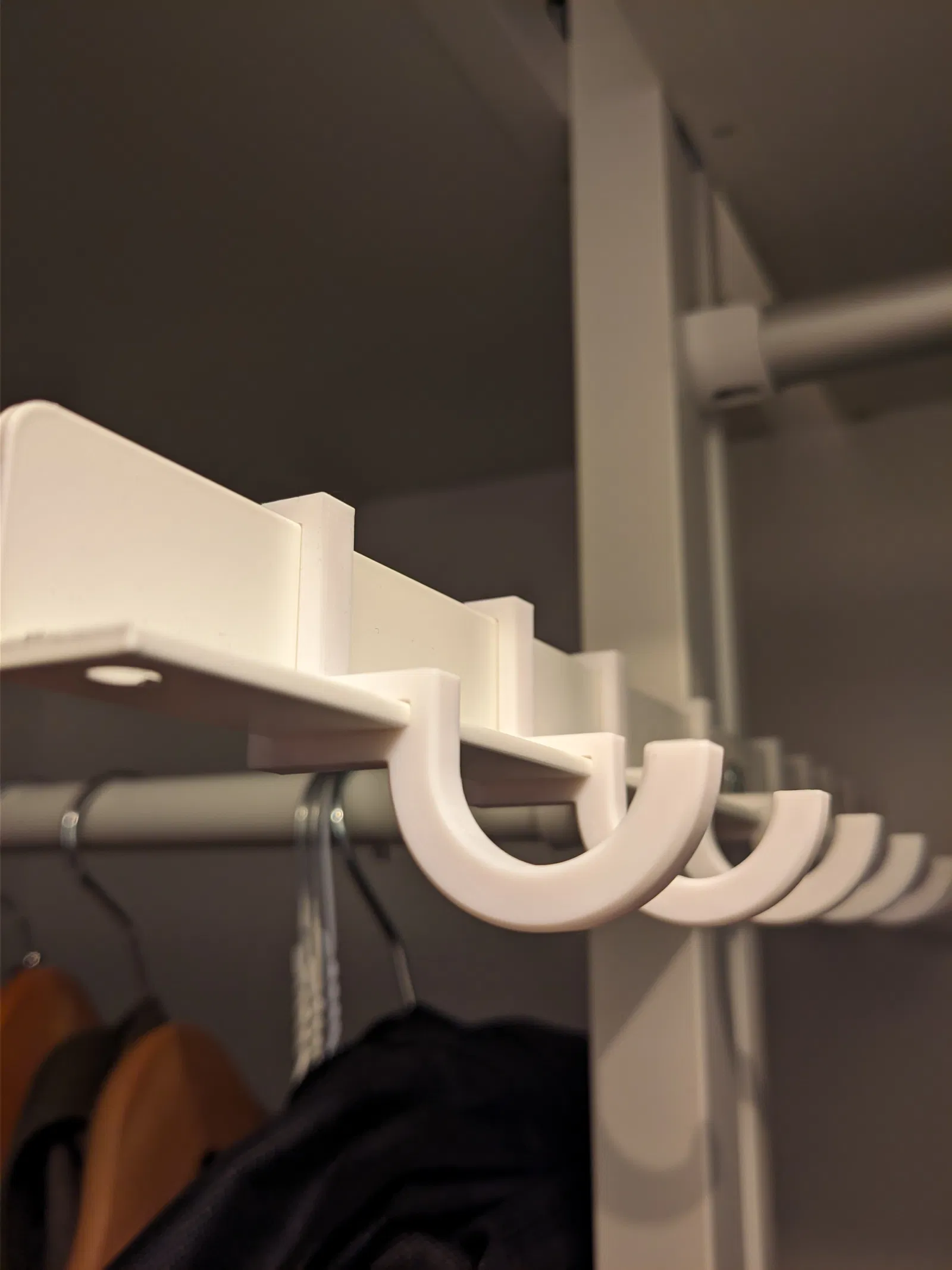 Bộ móc gắn kệ IKEA ELVARLI, được thiết kế để treo đồ vật dài hoặc làm thanh treo quần áo trong tủ. Phù hợp với hệ thống kệ ELVARLI của IKEA, mang đến giải pháp lưu trữ linh hoạt và tiện dụng cho không gian nhà bạn.