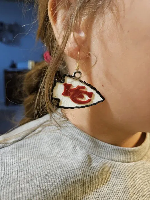Bông tai cho đội Kansas City Chiefs. In với tỉ lệ 50% và thêm bước đổi màu ở tầng 9 để tạo điểm nhấn cho chi tiết mũi tên. Hoàn hảo cho fan hâm mộ đội bóng bầu dục này!